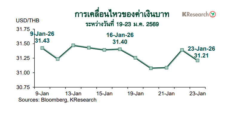 สำหรับสัปดาห์ระหว่างวันที่ 26-30 ม.ค. 2569 ธนาคารกสิกรไทยมองกรอบการเคลื่อนไหวของค่าเงินบาทที่ระดับ 30.70-31.60 บาทต่อดอลลาร์ฯ ขณะที่ศูนย์วิจัยกสิกรไทยประเมินปัจจัยสำคัญที่ต้องติดตาม ได้แก่ ผลการประชุม FOMC (27-28 ม.ค.) รายงานเศรษฐกิจและการเงินเดือนธ.ค. ของไทย ฟันด์โฟลว์ของต่างชาติ การเคลื่อนไหวของสกุลเงินเอเชียและราคาทองคำในตลาดโลก