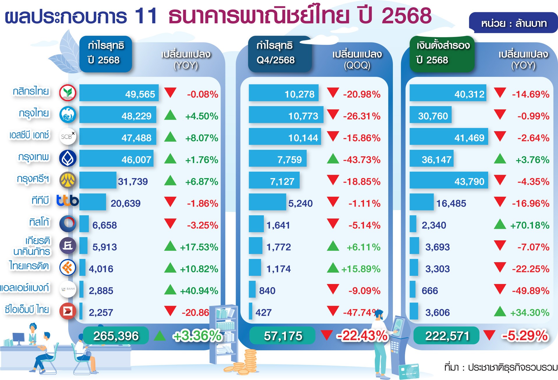 คงได้เห็นผลงานในปี 2568 ของธนาคารพาณิชย์ 11 แห่ง ที่แจ้งงบการเงินงวดไตรมาส 4/2568 และงวดปี 2568 ต่อตลาดหลักทรัพย์แห่งประเทศไทย (ตลท.) กันไปแล้ว ประกอบด้วย บมจ.เอสซีบี เอกซ์ (SCB) ธนาคารกรุงเทพ (BBL) ธนาคารกสิกรไทย (KBANK) ธนาคารกรุงไทย (KTB) ธนาคารกรุงศรีอยุธยา (BAY) ธนาคารทหารไทยธนชาต (ttb) ธนาคารทิสโก้ (TISCO) ธนาคารเกียรตินาคินภัทร (KKP) ธนาคารซีไอเอ็มบี ไทย (CIMBT) ธนาคารแลนด์ แอนด์ เฮ้าส์ (LHFG) และธนาคารไทยเครดิต (Credit)