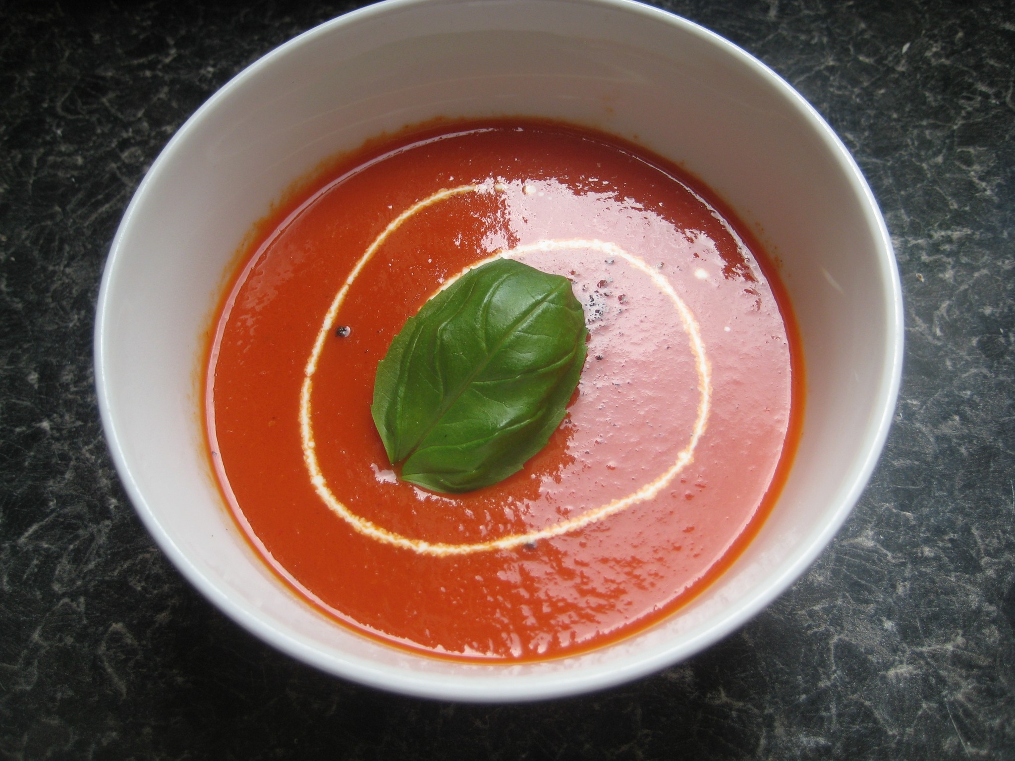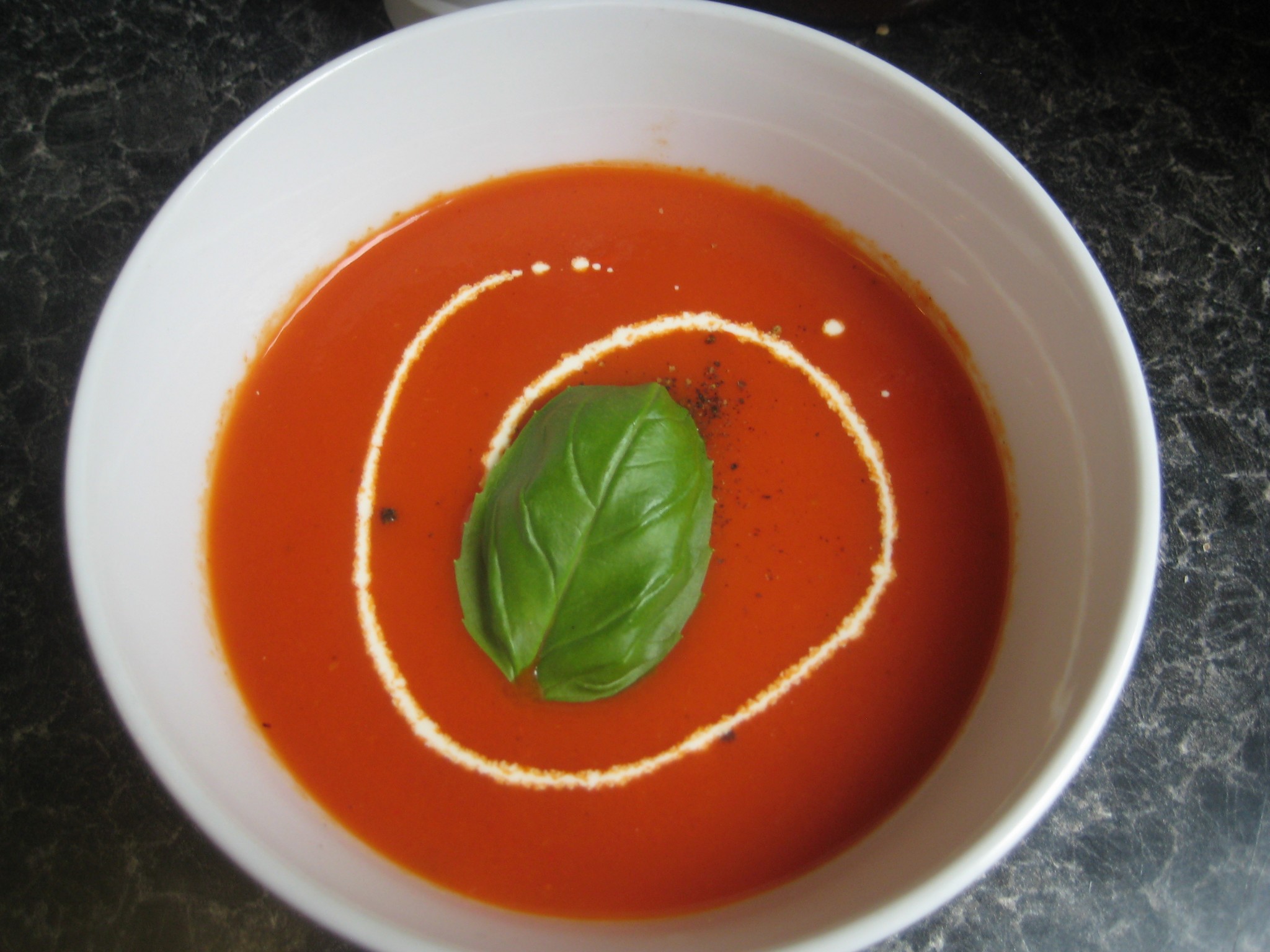ตักซุปใส่ถ้วย ตกแต่งด้วยครีม พริกไทยป่น และใบโหระพา(basil) ยกเสิร์ฟ