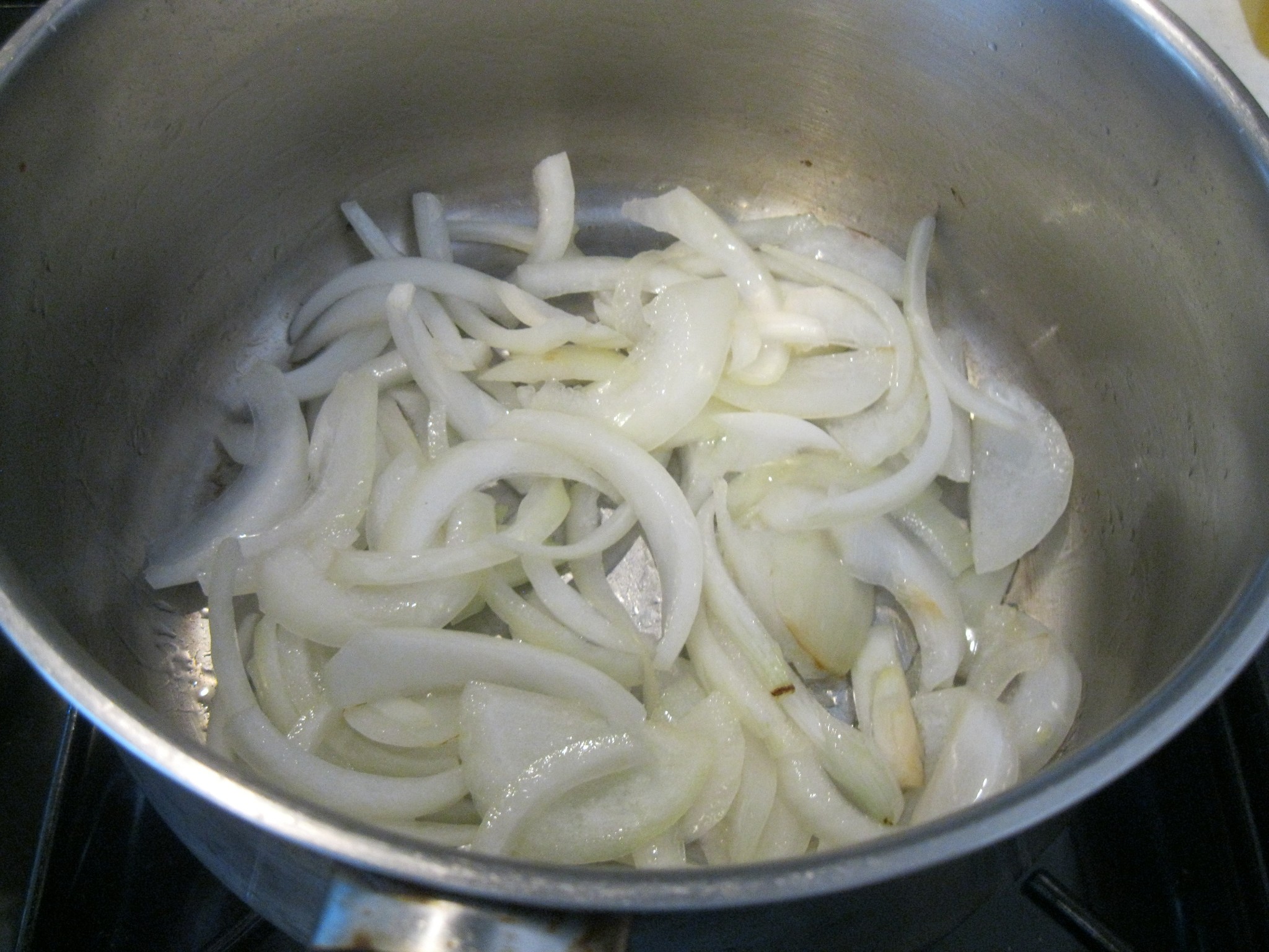 ตั้งหม้อน้ำมันมะกอกและเนยสดบนเตาใช้ไฟกลาง คนให้เนยละลาย ใส่หัวหอมลงผัดให้พอเริ่มหอม
