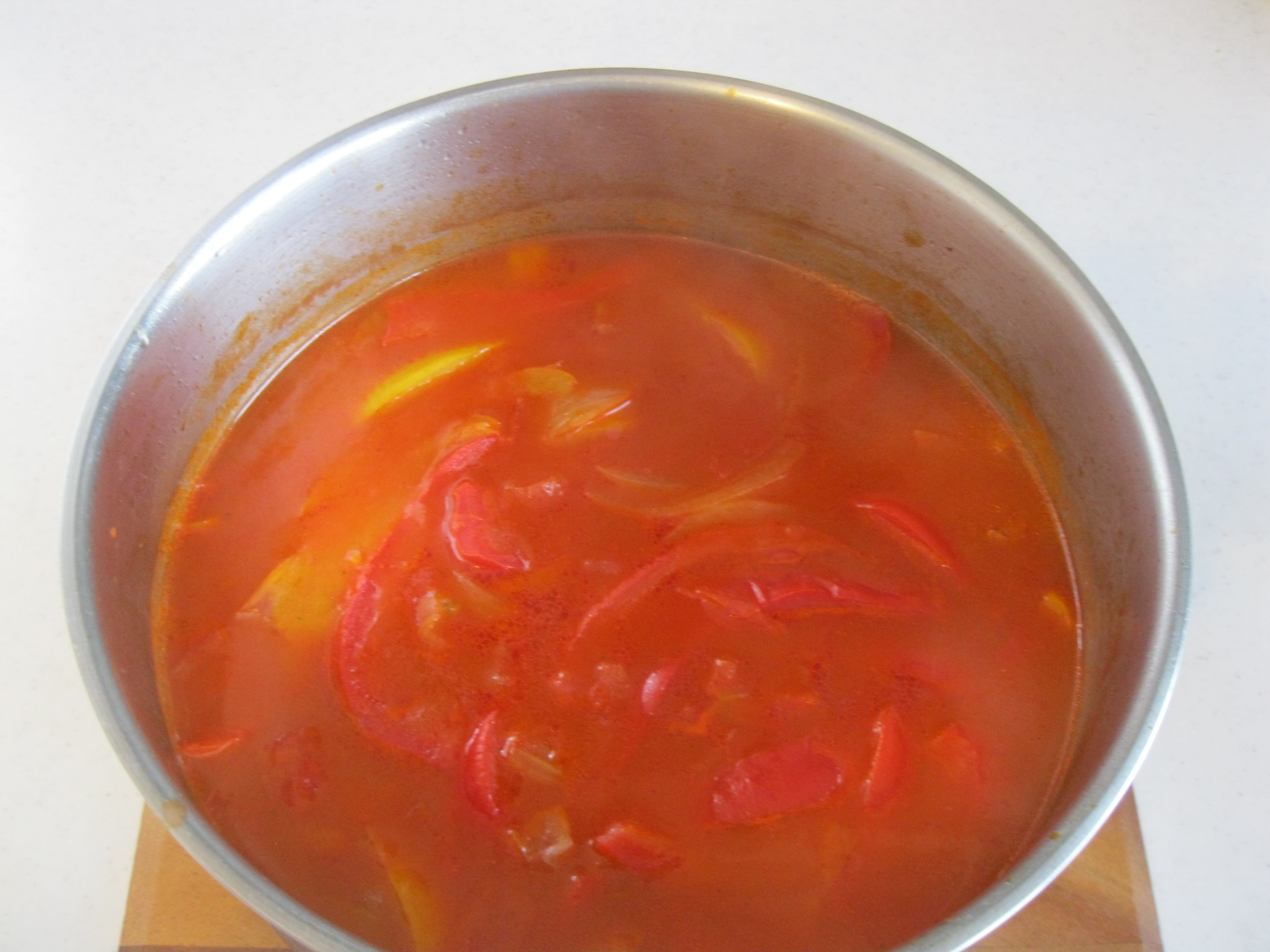ใส่มะเขือเทศกระป๋อง ผงปาปริก้า น้ำสต๊อกผัก ซอสมะเขือเทศเข้มข้น ต้มเคี่ยวทุกอย่างสุกนิ่มให้เข้ากัน