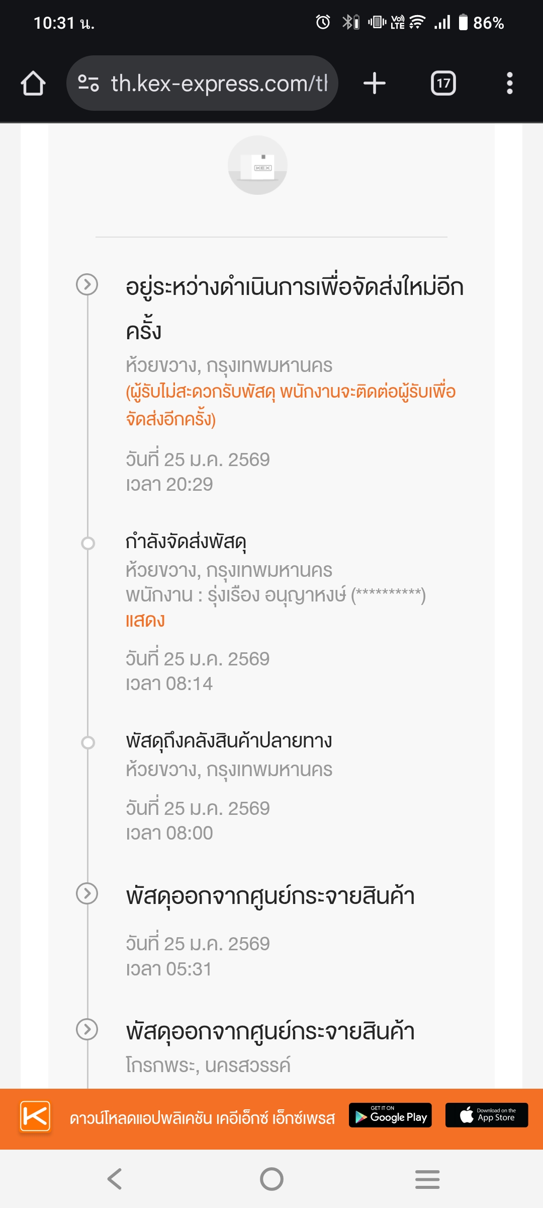 เมื่อวานเป็น due date พัสดุ Kerry ของเราจำนวน 2 กล่อง ซึ่งขึ้นสถานะใน tracking ตั้งแต่เช้าว่ากำลังนำส่ง เรารอจนดึกสถานะในระบบถึงเปลี่ยนเป็นไม่สามารถติดต่อได้ ทำให้ของไม่มาส่ง ทั้งที่เมื่อวานมีขนส่งอ