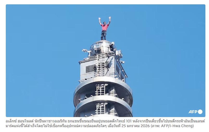 ไทเป: เมื่อวันอาทิตย์ที่ 25 มกราคม นักปีนเขาชาวอเมริกันคนหนึ่งได้ปีนขึ้นไปบนตึกที่สูงที่สุดของไต้หวันโดยไม่ใช้เชือกหรืออุปกรณ์ความปลอดภัยใดๆ ซึ่งเป็นการกระทำที่กล้าหาญและดึงดูดผู้ชมหลายร้อยคนมารวมตัวกันที่ฐานของตึก และอีกมากมายที่รับชมทางออนไลน์ผ่านการถ่ายทอดสดทาง Netflix