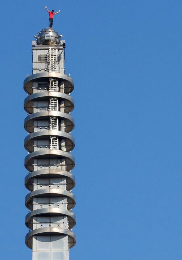 เสียงเชียร์ดังสนั่นจากฝูงชนที่อยู่ด้านล่างเมื่อเขาปีนขึ้นไปถึงยอดหอคอยได้สำเร็จประมาณ 90 นาทีหลังจากเริ่มปีน เขาใส่เสื้อยืดสีแดงและรองเท้าปีนเขาสีเหลืองที่สั่งทำพิเศษ โบกมือไปมาเหนือศีรษะ
