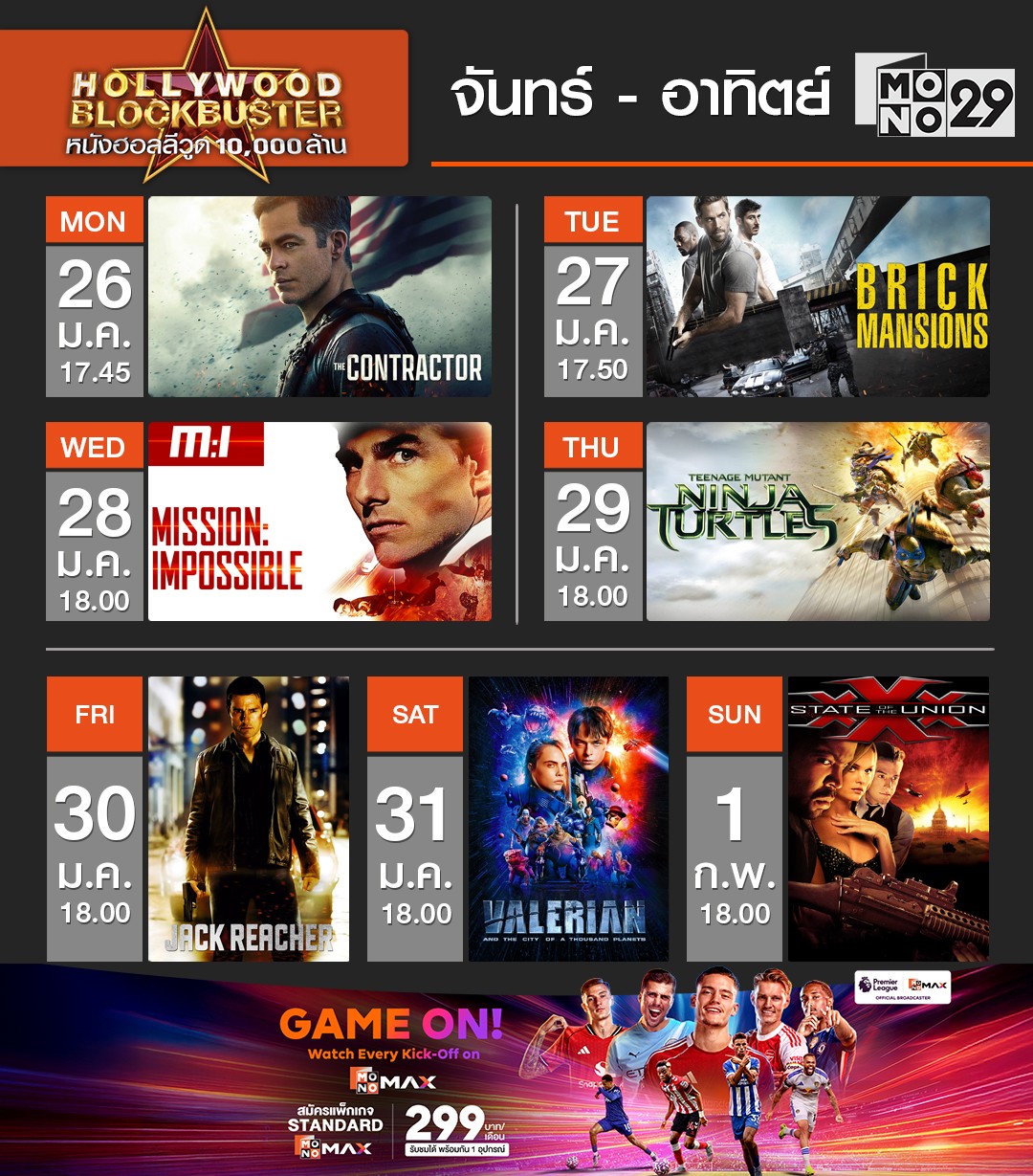 Hollywood Blockbuster หนังฮอลลีวูด 10,000 ล้าน วันที่ 26 มกราคม - 1 กุมภาพันธ์ เวลา 18.00 น. ทางช่อง MONO29