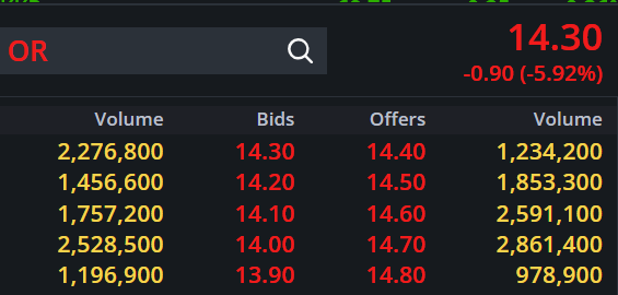 สำนักข่าวอินโฟเควสท์ (26 ม.ค. 2569)--เมื่อเวลา 15.25 น. OR ร่วง 5.26% ลดลง 0.80 บาท มาที่ 14.40 บาท มูลค่าการซื้อขาย 637.04 ล้านบาท จากราคาเปิด 15.00 บาท ราคาสูงสุด 15.30 บาท และราคาต่ำสุด 14.20 บาท
