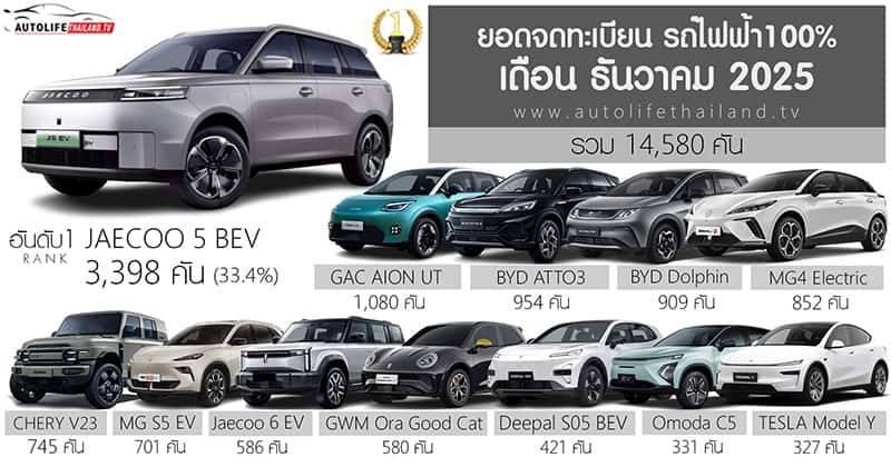 ยอดจดทะเบียน รถไฟฟ้า100% ในไทย ธันวาคม 2025 รวม 14,580 คัน | เพิ่มขึ้น +171.3% JAECOO 5 ครองแชมป์