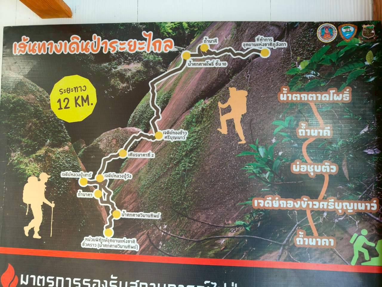 เส้นทางการเดินตลอดเส้นทาง 12 km ครับ ขึ้นจากที่ทำการอุทยานฯภูลังกา ต่อไปถึงถ้ำนาคี , เจดีย์กองข้าวศรีบุญเนาว์ต่อไปที่ถ้ำนาคา ก่อนจะลงไปที่หน่วยพิทักษ์น้ำตกตาดวิมานทิพย์