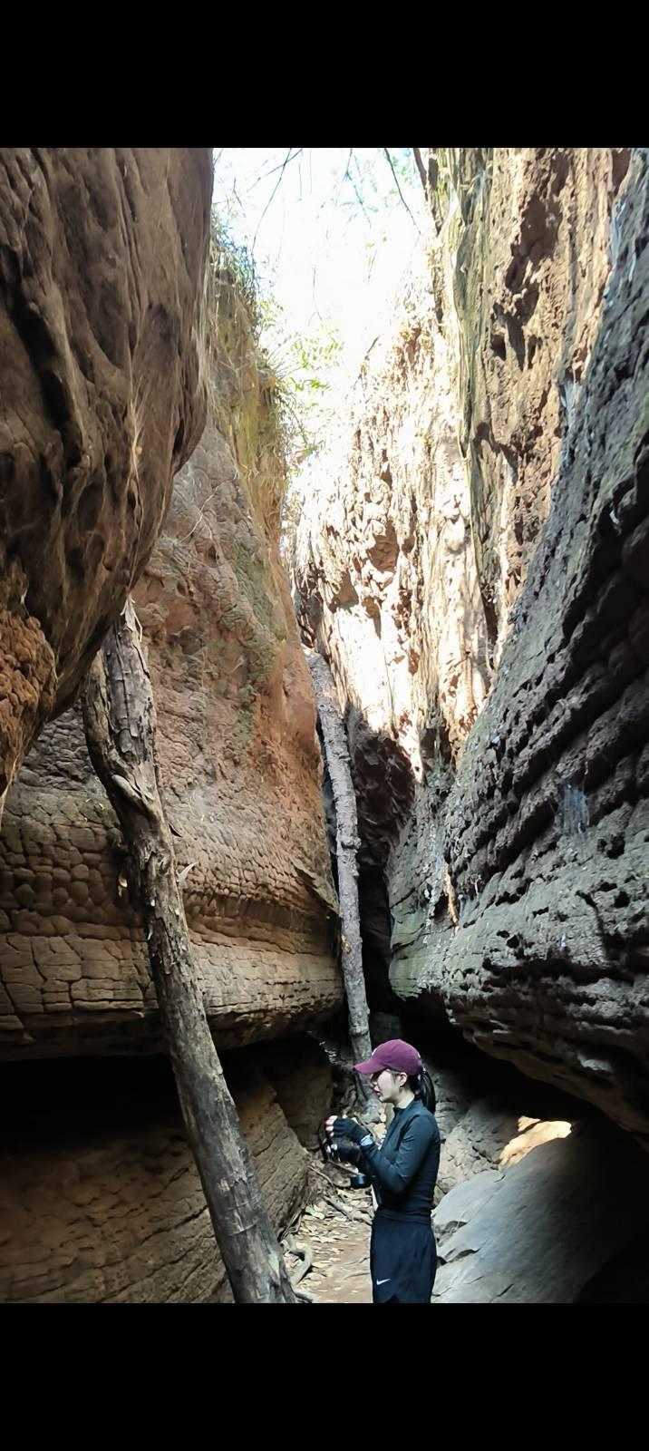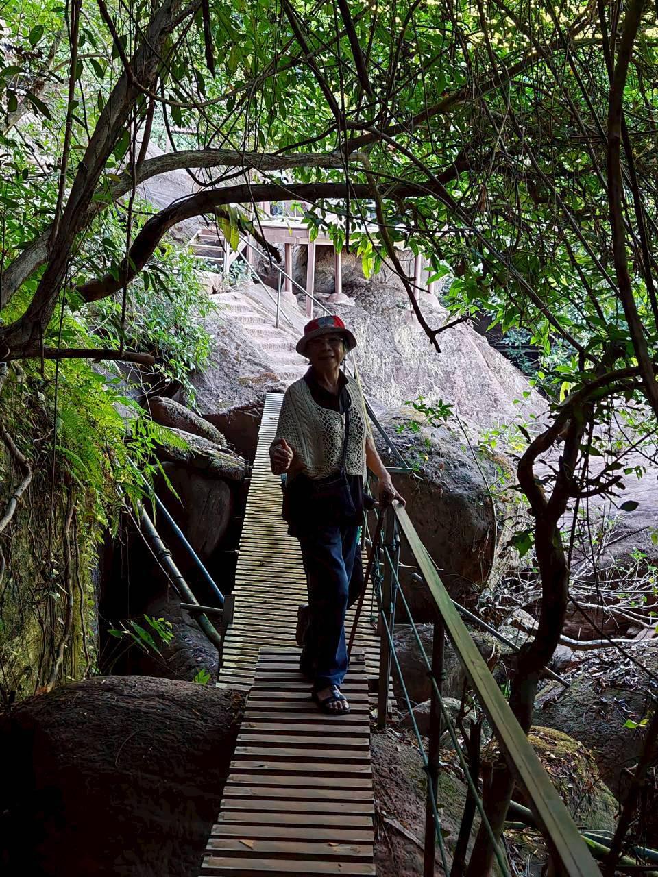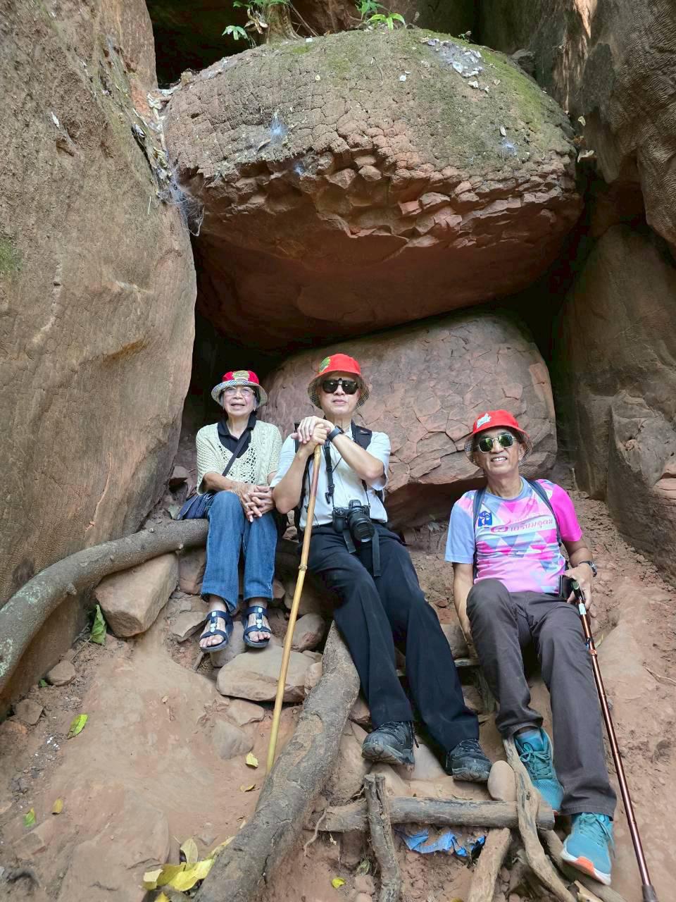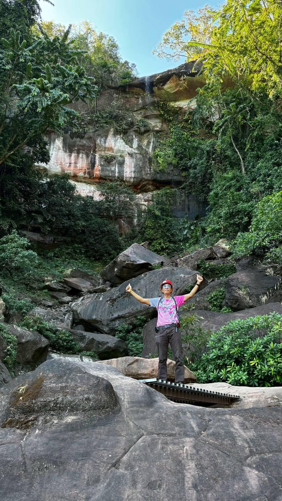 พอเห็นแบบนี้สว.หลายคนก็น่าจะถอยครับเราจึงปรับเป็น เดินสำรวจ 2 วัน คือวันแรกไปขึ้นแค่ถ้ำนาคีแล้วกลับทางเดิมช่วงนี้ไปกลับ 4.9 km ทุกคนลงสนามครับ เราต้องมีไกด์ครับ ก็เป็นอาสาสมัครของทางอุทยาน ซึ่งก็ให้ความรู้และแนะนำเส้นทางได้อย่างดี