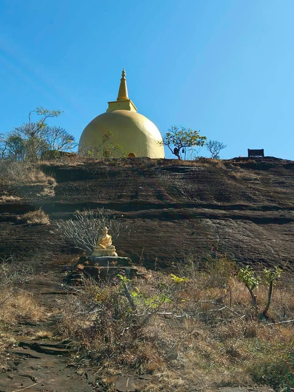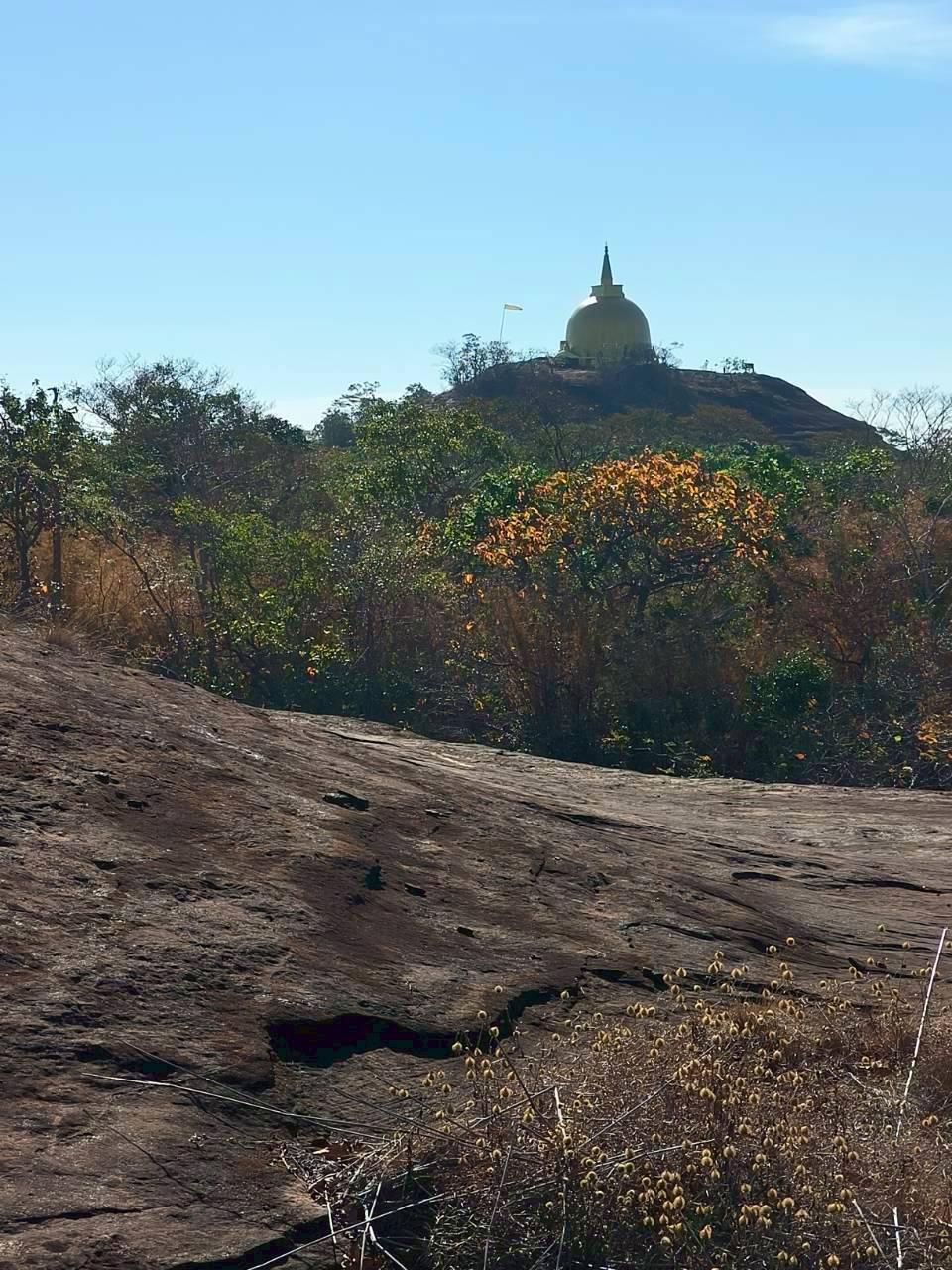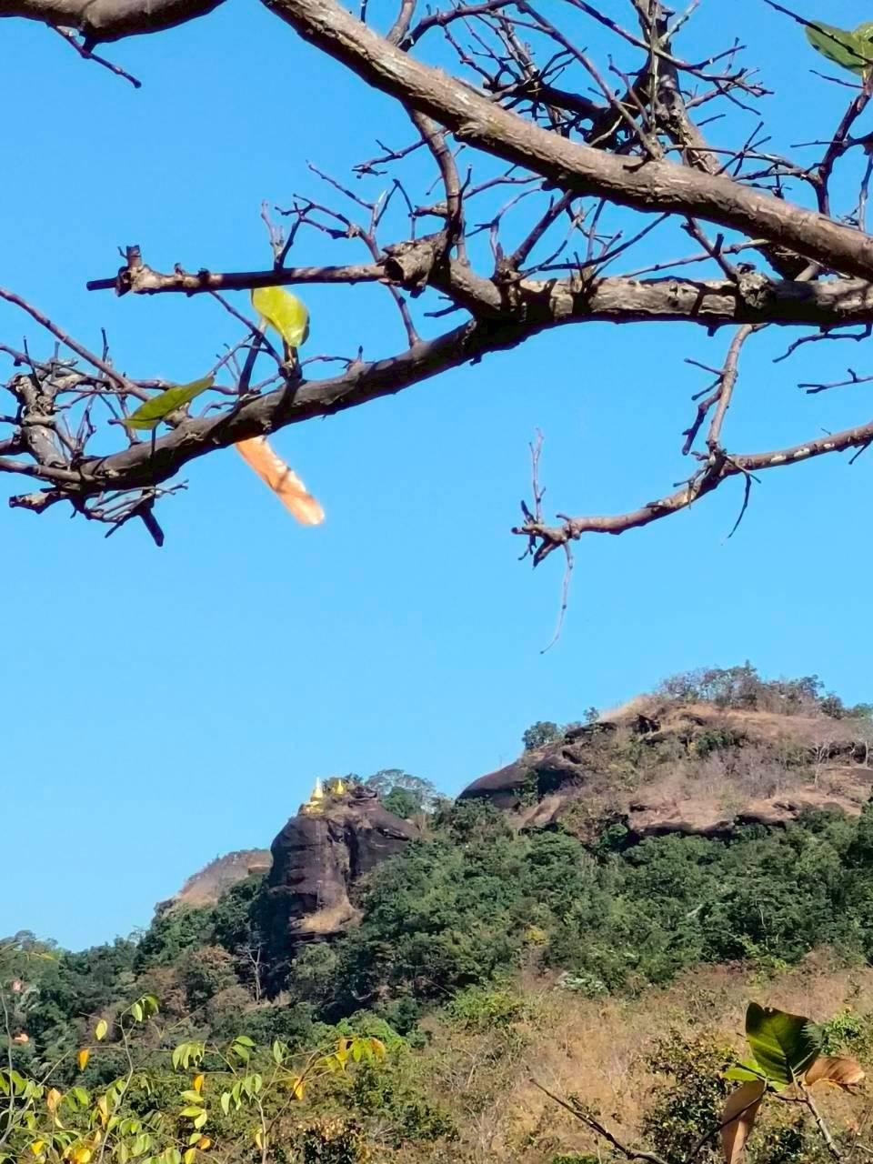 เราทานอาหารกันบริเวณนี้ แล้วจึงเริ่มออกเดินไปยังเจดีย์กองข้าวฯหรือที่บางคนอาจจะเรียกว่าพระธาตุภูลังกา ซึ่งเส้นทางเป็นการเดินไปบนภูเขาหินปูนขึ้นจนถึงจุดสูงสุด ก็จะเป็นที่ตั้งของเจดีย์สีทองสุกอร่ามโดยเฉพาะเมื่ออยู่กลางเปลวแดด เจดีย์สีทองตั้งอยู่บนลานหินกว้างจึงดูคล้ายกองข้าวซึ่งเป็นที่มาของชื่อภายในบรรจุพระบรมสารีริกธาตุ จากเนปาล