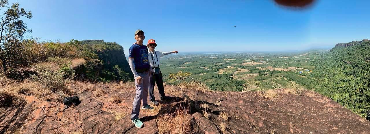 วันที่สองมีสมาชิกยอมมาเดินเหลือแค่ 2 คนครับเพราะเราต้องเดินขึ้นทางเจดีย์กองข้าวศรีบุญเนาว์และเดินยาวไปเกือบ 10 kmแล้วไปทางถ้ำนาคาและไปลงที่หน่วยพิทักษ์อุทยานแห่งชาติตาดพิมานทิพย์ เส้นทางนี้จะค่อนข้างชันครับช่วงแรกจะเป็นบันไดปูนชันๆเราจะผ่านจุดแวะที่สำคัญคือจุดชมวิว เจดีย์ห้าพระองค์ ประตูโขงและถ้ำลอด ก่อนที่จะขึ้นสู่ลานโล่งๆเป็นจุดกางเต็นท์ ซึ่งถ้าเราขึ้นทางถ้ำนาคีและเดินตัดภูเขามาก็จะมาบรรจบกันที่จุดนี้ได้ จะมองเห็น เจดีย์กองข้าวศรีบุญเยาว์อยู่ใกล้ๆ