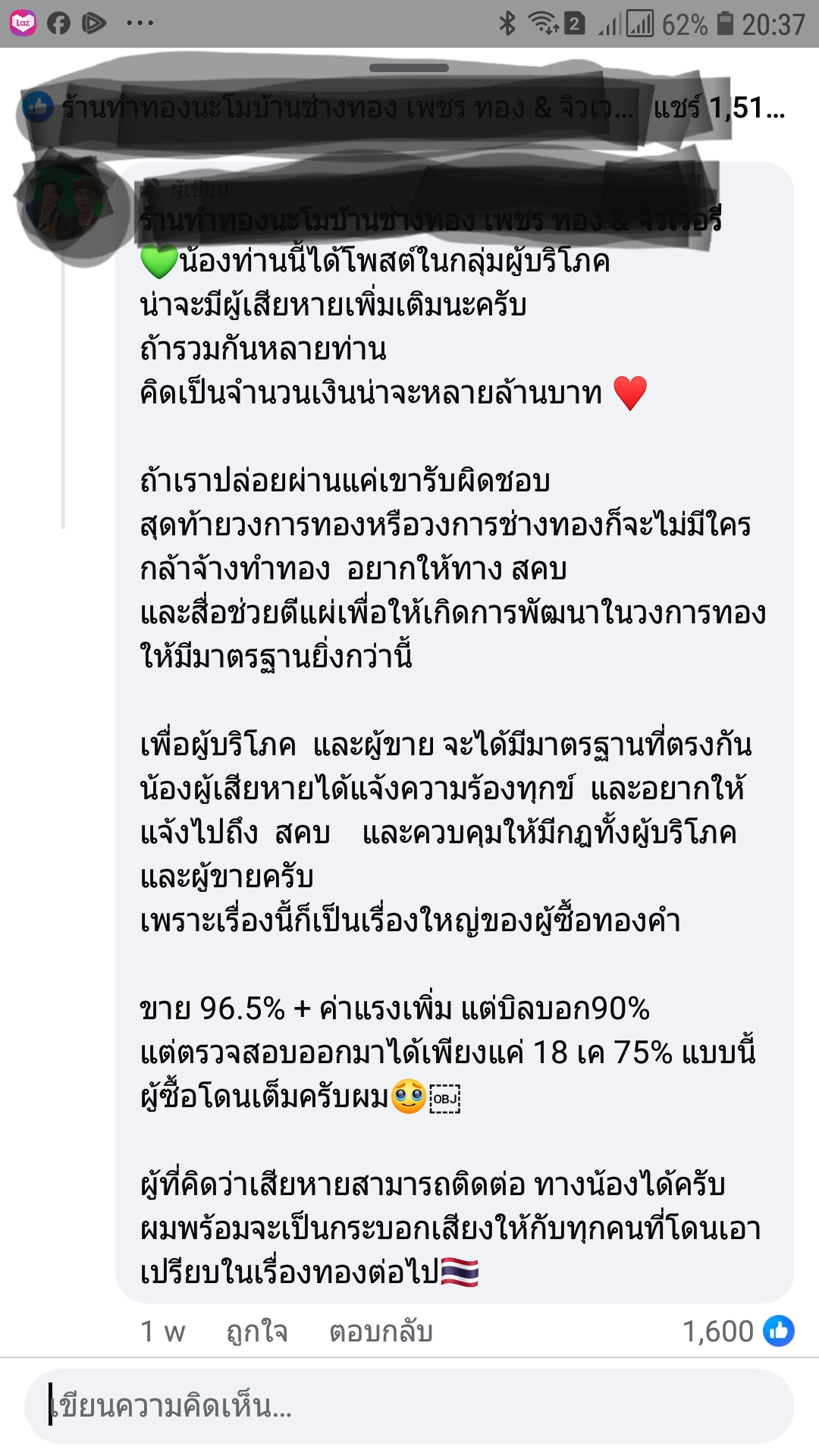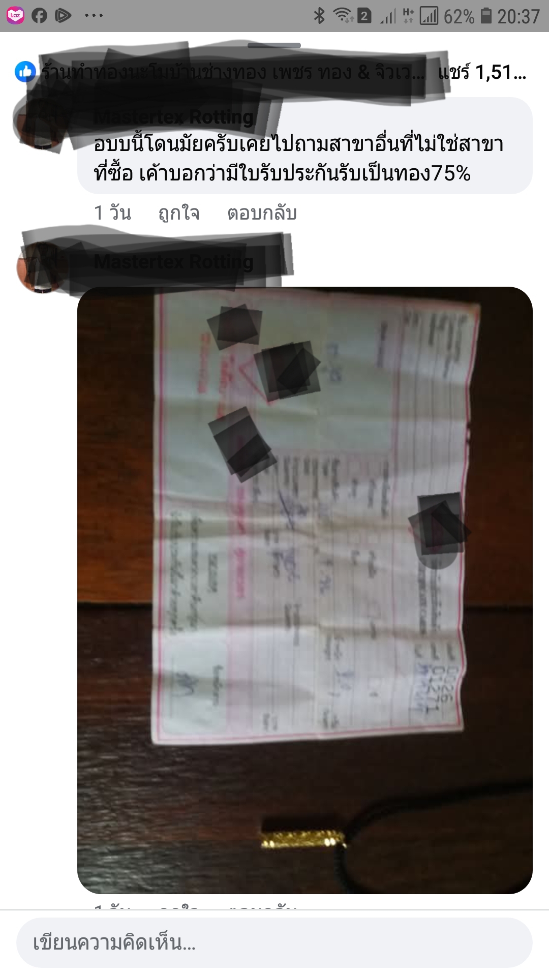 และล่าสุดได้ลองเอาทองไปขายสาขาที่เคยซื้อ ไปถามว่าได้เท่าไหลพร้อมกับใบรับประกัน ที่ระบุว่าเป็นทอง 90% (แต่ตอนซื้อในราคาทอง96.5%) ทางร้านตีเป็นทอง75% ผมบอกว่าทำมัยในใบบอกทอง90%แล้วมาตีเป็นทอง75%ได้ไง และบอกว่าตอนชื้อผมจ่ายในราคาทอง96.5% ด้วยซำ บอกว่าดูข่าวในเน็ตมีร้านทองทำแบบนี้งะ แต่ไม่นึกว่าร้านระดับนี้จะทำแบบนี้กับลูกค้าด้วย น้องทางร้านชื่อแก้ว บอกเดี๋ยวถามใครให้ก็ไม่รู้ในไลน์ สรุป จะรับคืนในทอง75%(คุณเอาทอง75%มาขายในราคาทอง96.5% แล้วในใบยังระบุไม่ตรงกับ%ทองที่ซื้อ)  คือโดงใช่มัยแบบนี้