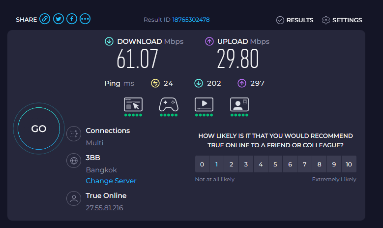 แต่สิ่งที่ได้คือ Speedtest วิ่งอยู่แค่ 60 Mbps! (ตามรูป) นี่คือความเร็วของโปรระดับท็อปในย่าน "อารีย์" หรอครับ? พื้นที่ไข่แดงของกรุงเทพฯ สัญญาณควรจะดีที่สุดไม่ใช่เหรอ?