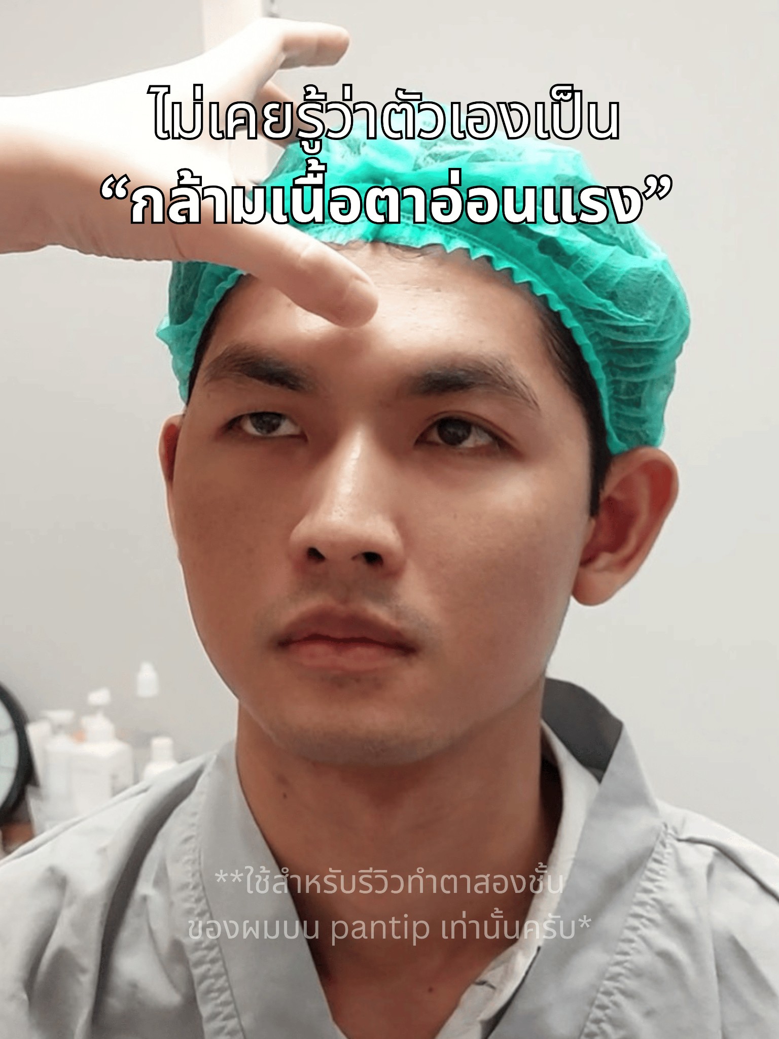 ตอนแรกคิดว่ากะมาแค่ทำตาสองชั้นธรรม แบบที่คนทั่วไปทำกัน แค่ปรับให้มันเท่ากันก็คงโอเคขึ้น อะไรแบบนี้ครับ แต่พอปรึกษาหมอจริงๆ แล้วตรวจดู สรุปว่าเป็นภาวะกล้ามเนื้อตาอ่อนแรงครับ คือกล้ามเนื้อที่ยกเปลือกตาของเรามันอ่อนแอลง เลยไม่มีแรงจะยกหนังตาครับ อธิบายง่ายๆแบบที่หมอบอก ซึ่งหมอบอกว่าต่อให้ทำตาสองชั้นไป ยังไงก็ตกลงอีก เพราะไม่มีแรงพะยุงแล้ว ยังไงก็ต้องปรับกล้ามเนื้อ ยกขึ้นมาใหม่ สรุปผมก็เลยตัดสินใจทำกับคุณหมอครับ (ผมศึกษาดูรีวิวมาก่อนนานมากแล้ว เป็นปีครับถึงตัดสินใจทำ แต่ที่เป็นกล้ามเนื้อเนี่ยพึ่งมารู้เลย)