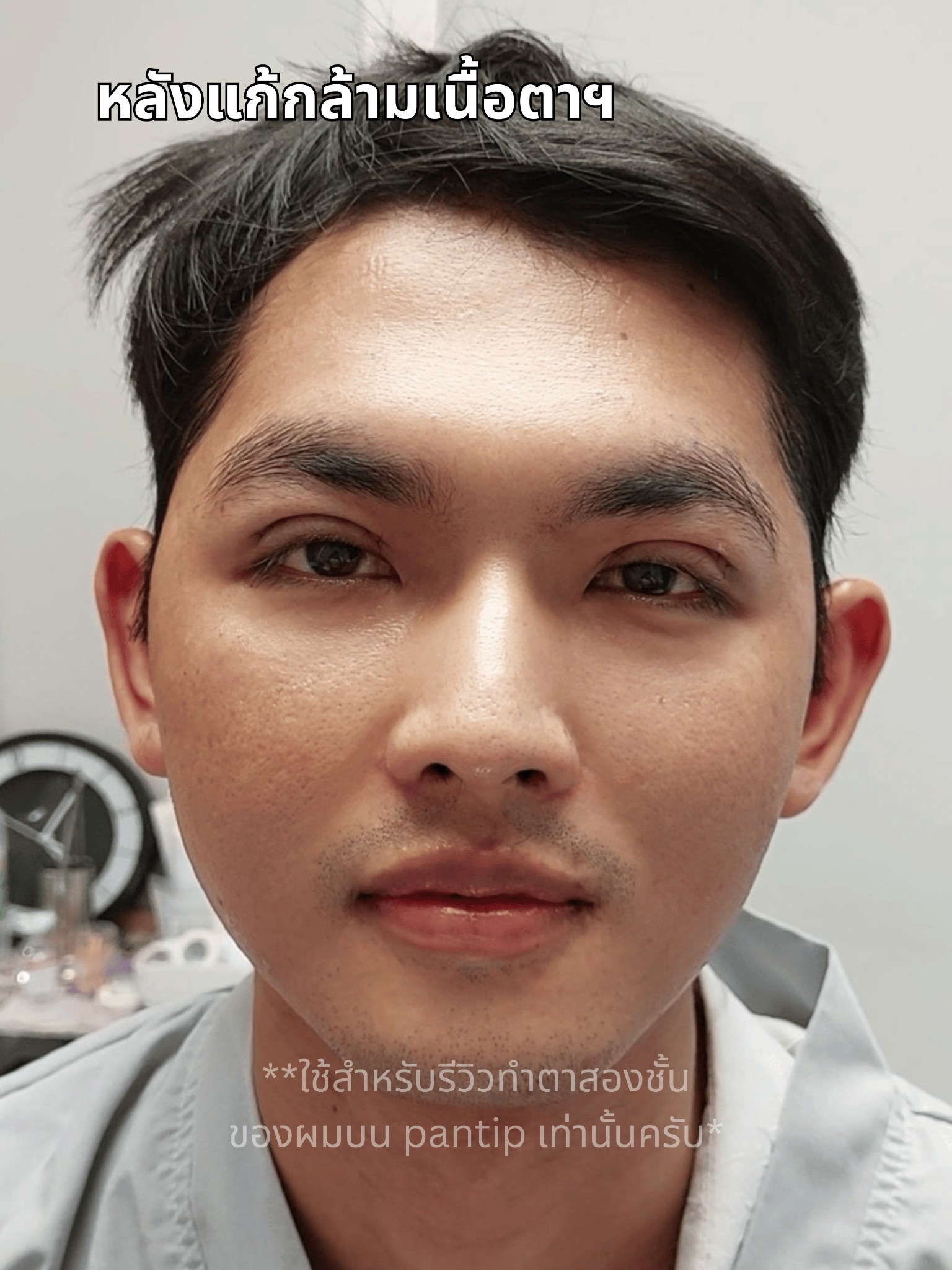 ขอข้ามไปตอนหลังทำทันที ถ้าเห็นว่าชั้นตามันใหญ่ขึ้นอย่าพึ่งตกใจกันนะครับ มันเป็นอาการบวม+ผมปรับกล้ามเนื้อข้างในด้วย หมอบอกจะบวมแบบนี้อีกพักใหญ่ๆเลย 1-2 เดือนครับ แต่หลังทำผมมีความรู้สึกอย่างนึงคือตามันสดใสแล้วเต็มตื่นอย่างที่ไม่เคยเป็นมาก่อนเลย ส่วนรูปเนี่ย ฝากน้องพนง.ถ่ายให้ ก็จะได้ประมาณนี้ครับ