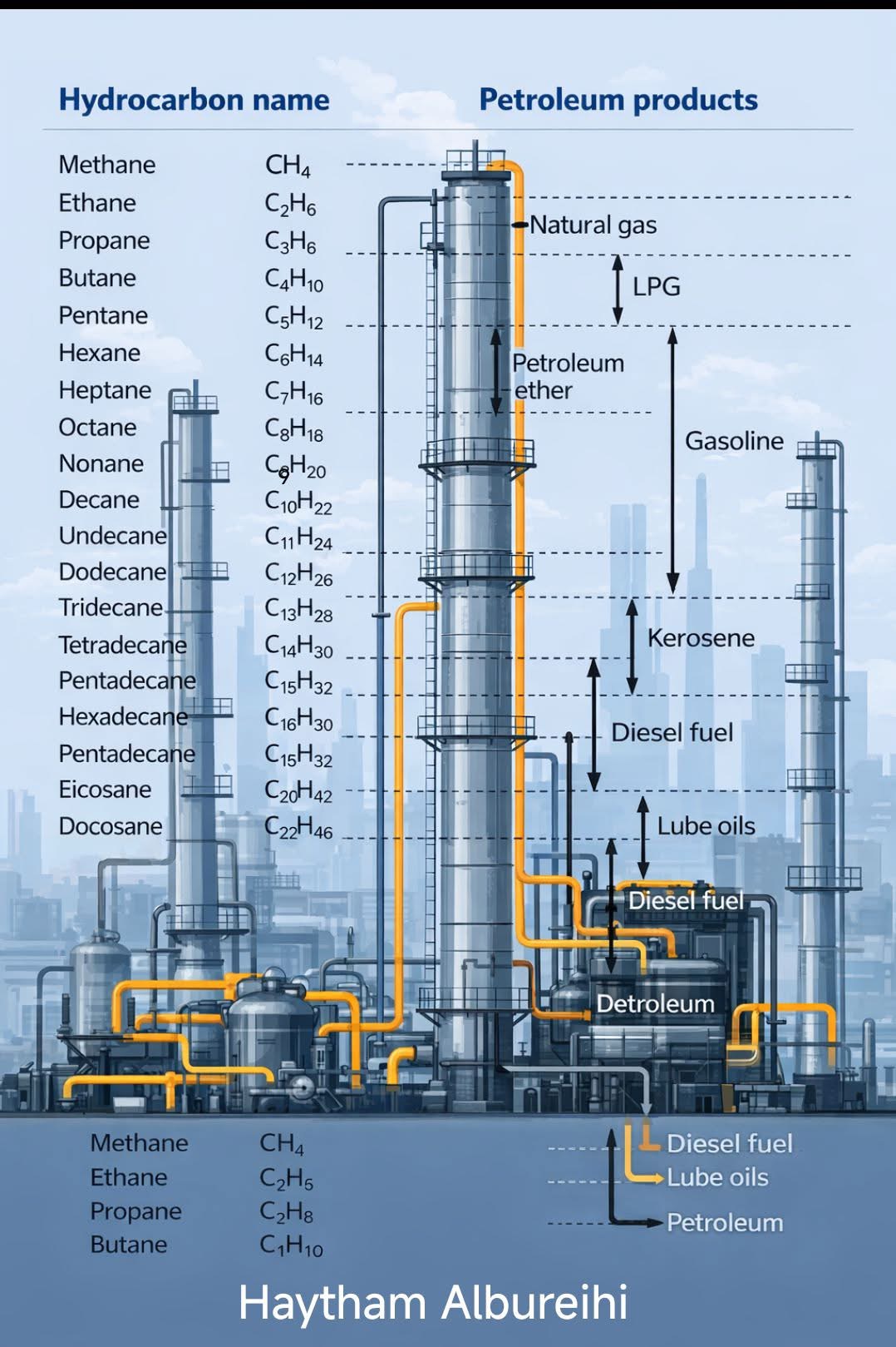 - เมื่อน้ำมันดิบ ถูกส่งเข้ามา เผาด้วยความร้อน (350–400°C) สิ่งมหัศจรรย์ก็เกิดขึ้น มันจะเริ่มแยกตัวออกจากกันตามจุดเดือดของแต่ละองค์ประกอบ: