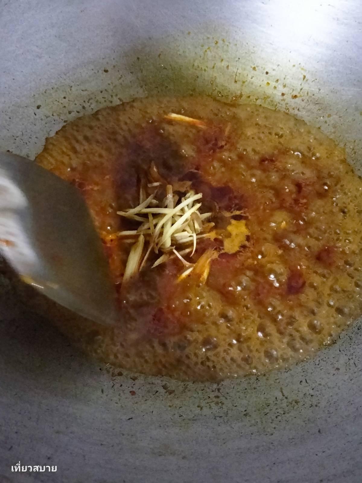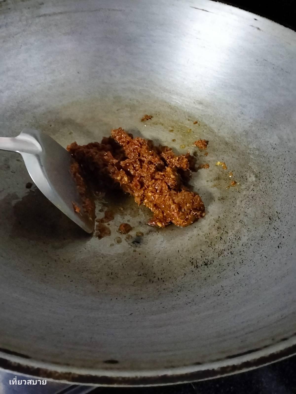 2. ตั้งกระทะใส่น้ำมัน พริกแกง ลงไปผัดจนแตกมัน เริ่มส่งกลิ่นหอม เติมน้ำเปล่าลงไปตามด้วย กระชายซอยผัดให้เข้ากัน