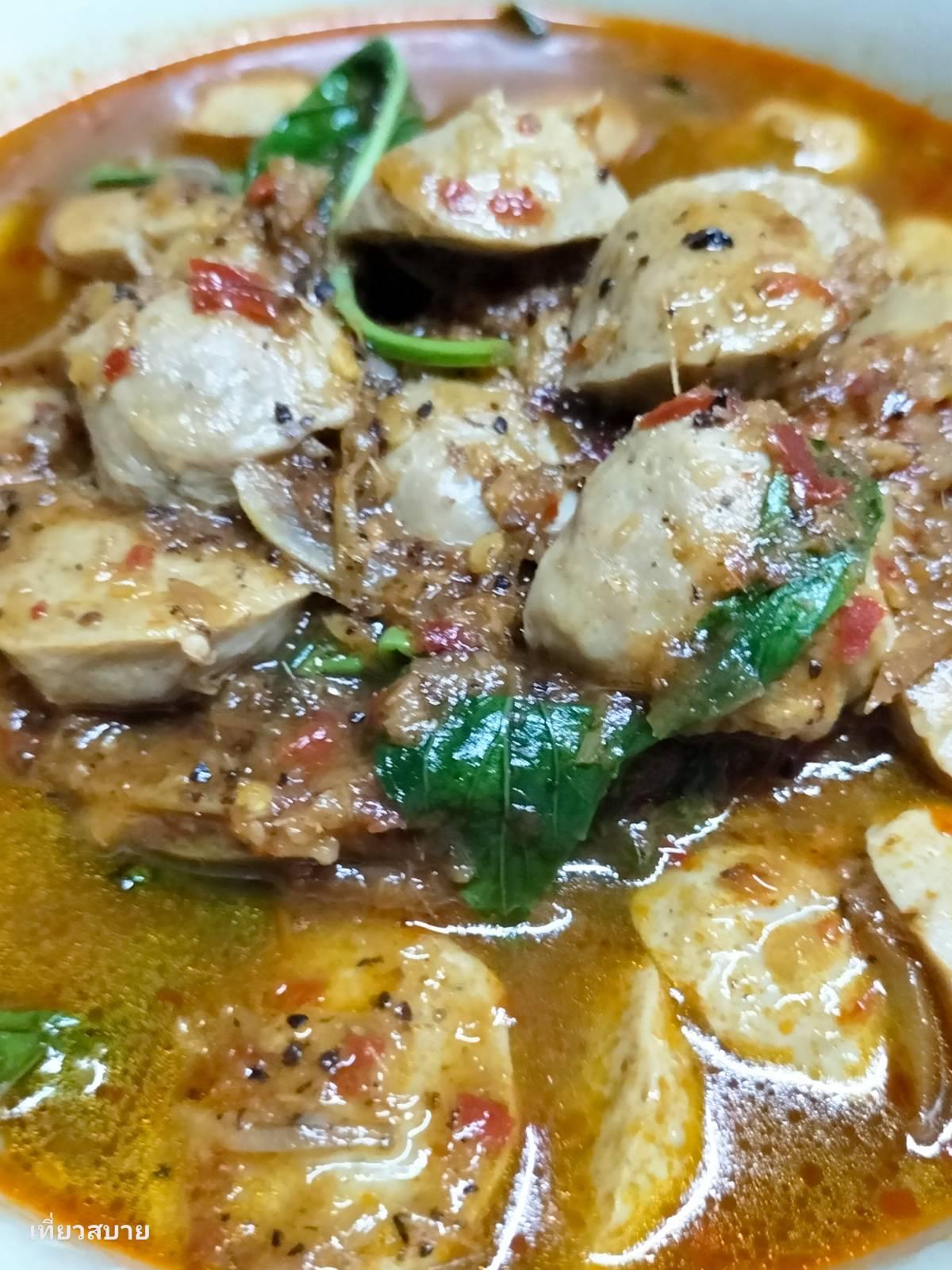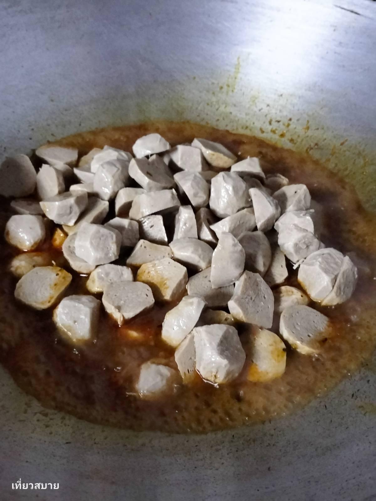 3. ใส่ลูกชิ้นลงไป ปรุงรสด้วยน้ำปลา ซอสหอยนางรม และน้ำตาลเล็กน้อย ชิมรสให้ได้ตามชอบ