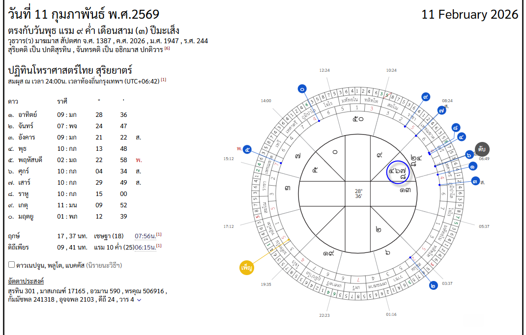 - พุธ(๔)กับราหู(๘) มีความหมายว่า เลือดตกยางออก อุบัติภัย ช่วงประมาณตั้งแต่ วันที่ 30 มกราคม - 6 เมษายน พ.ศ.2569 ทั้งคู่ยังได้ตำแหน่งวรโคตรนวางค์(รุนแรง) ในครึ่งเดือนแรกของเดือนกุมภาพันธ์