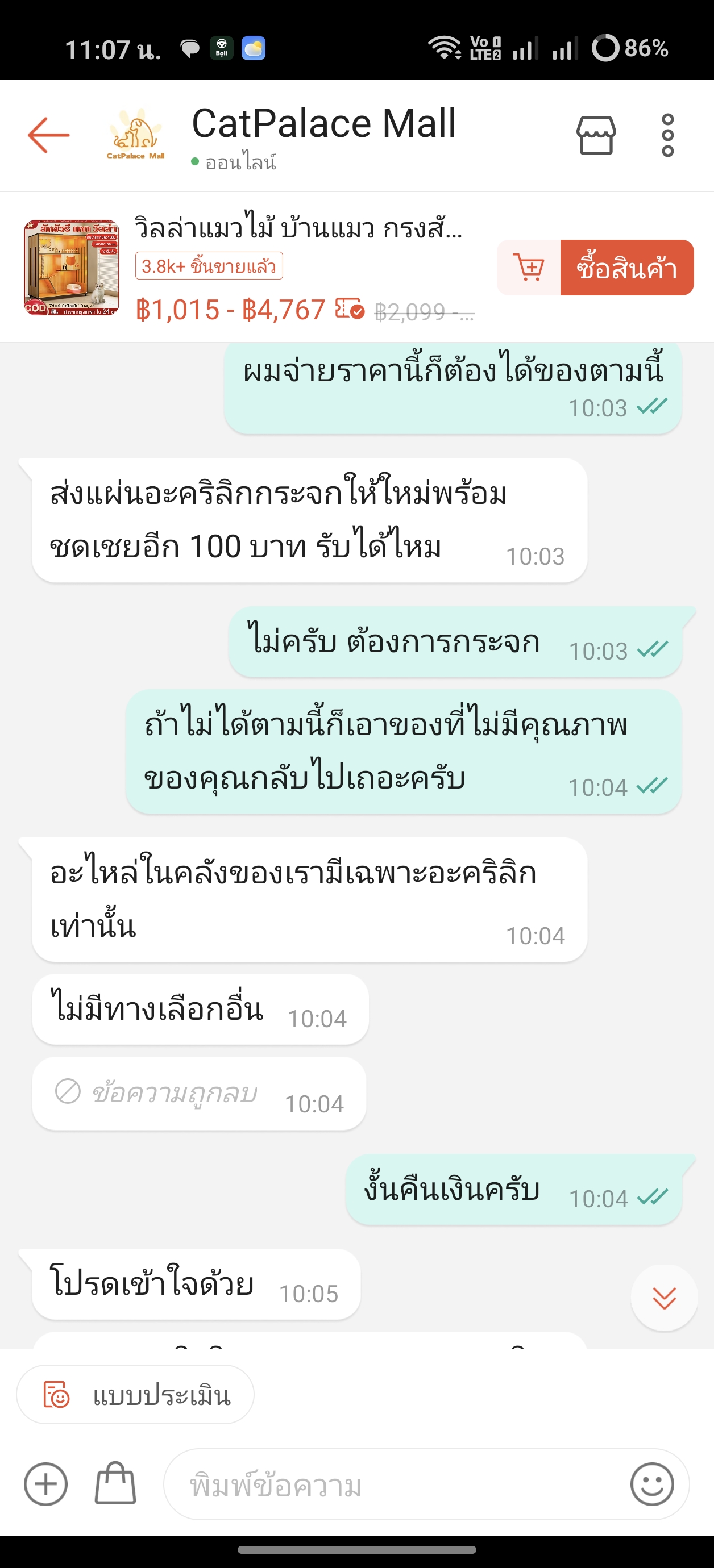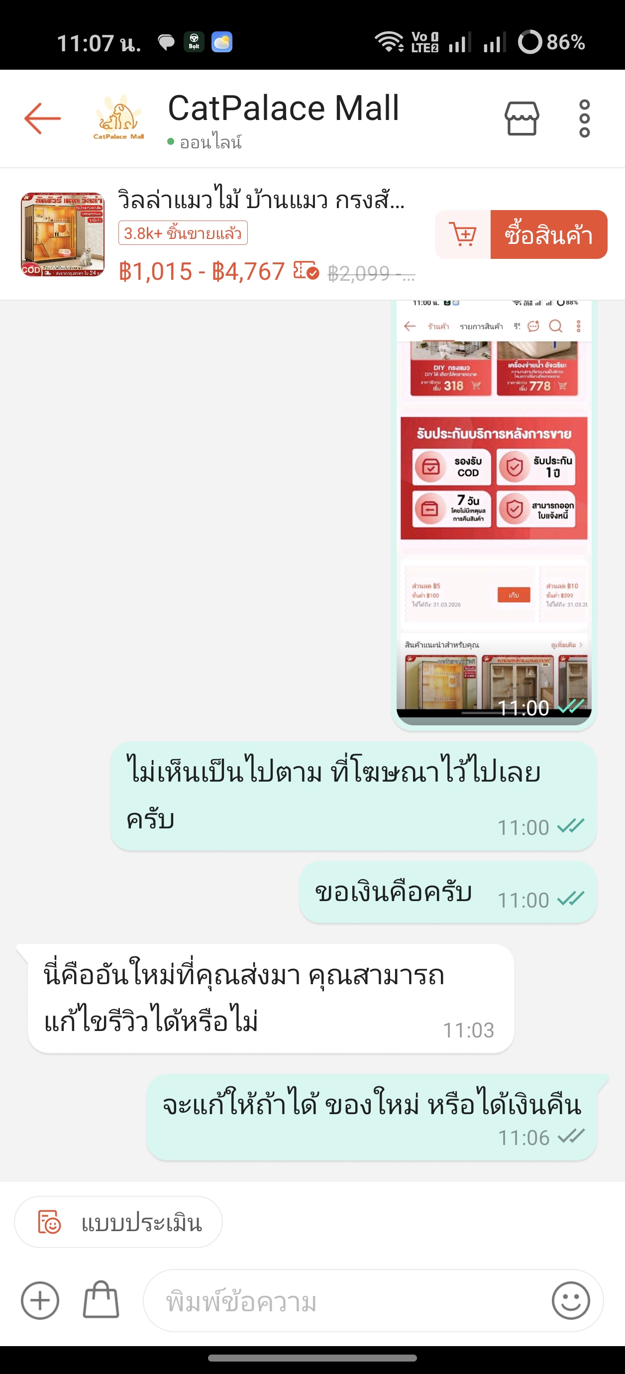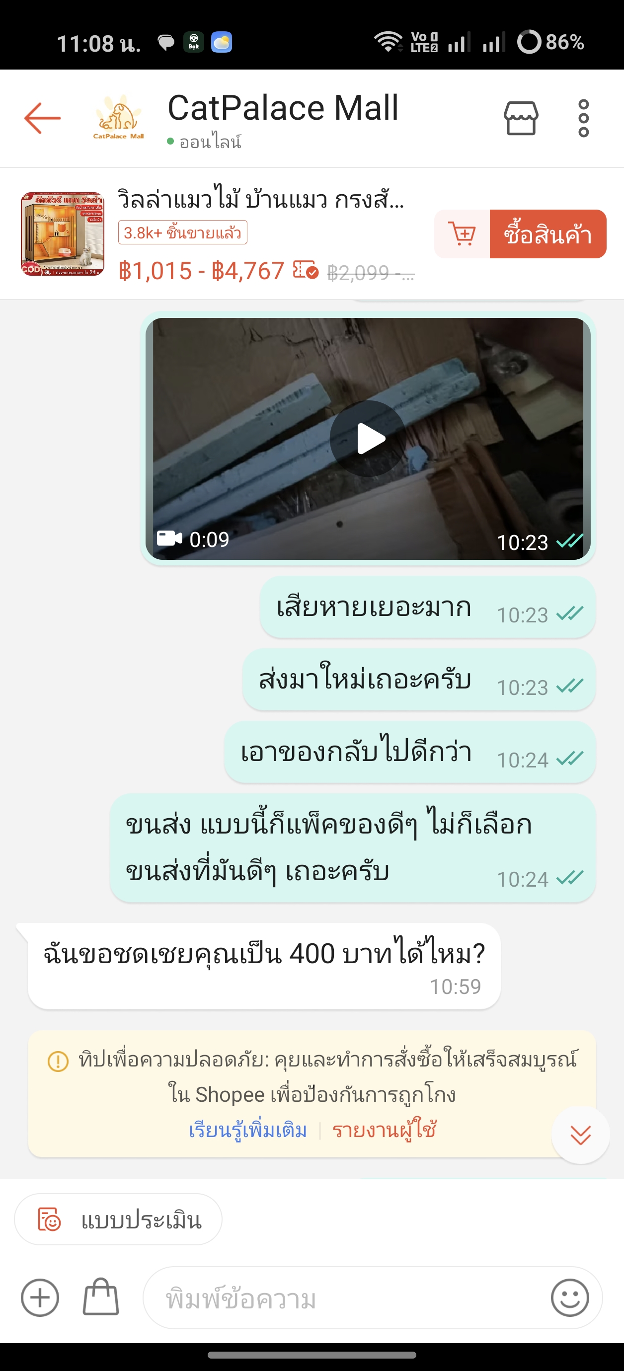 เราไปสั่งซื้อวิลล่าแมว มาจาก แอปส้ม เห็นว่ามันสวยแข็งแรง แต่สิ่งที่ได้กลับมา คือ ขนส่งช้า พอของมาถึงก็เป็นตามภาพ