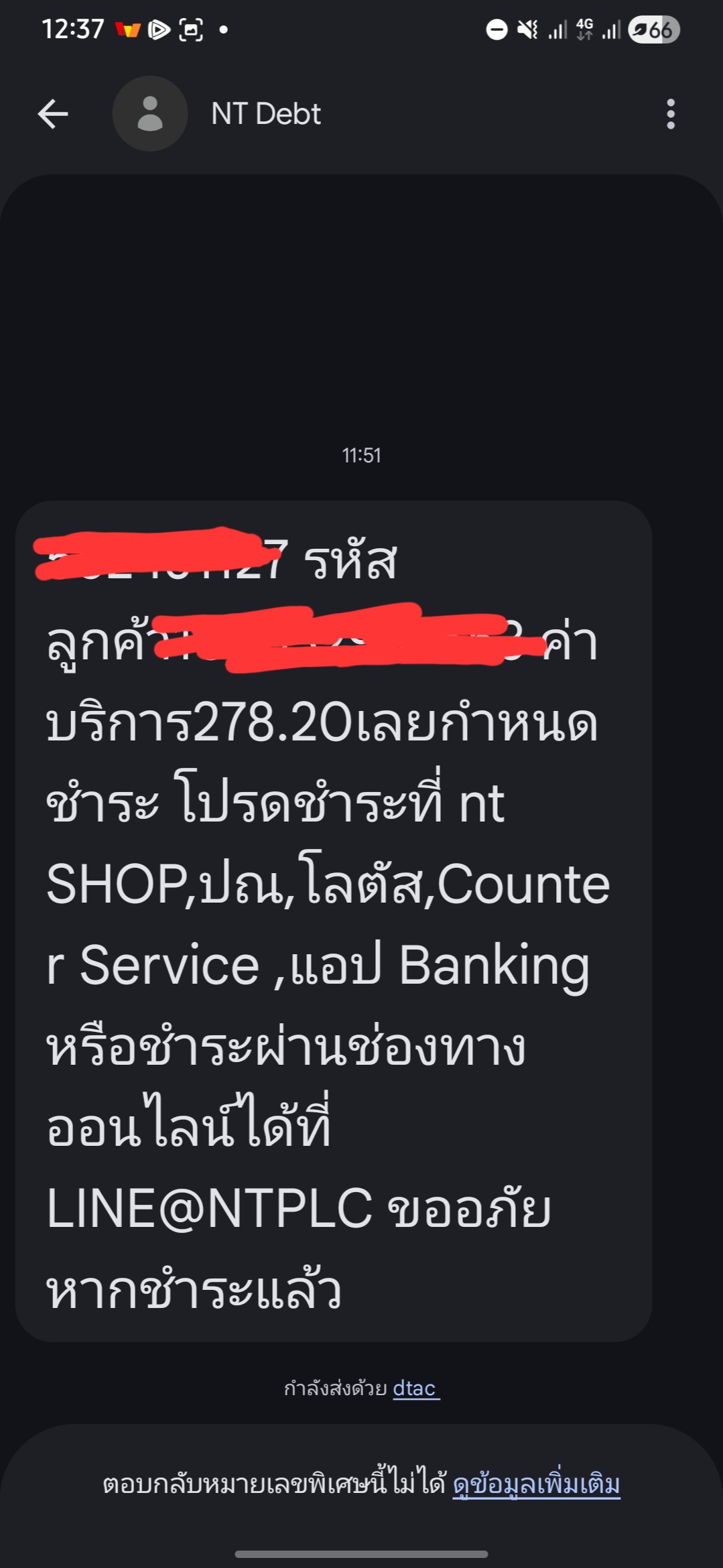 อยู่ๆมีข้อความเรียกเก็บเงินจากNT ทั้งๆที่ไม่ได้ใช้บริการ