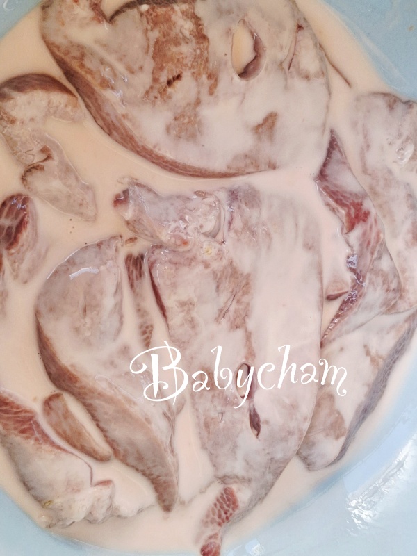 ขั้น 2. แม่เปปก็จะนำใส่ภาชนะที่มีฝาปิด ก่อนจะปิดฝา ก็เทนมสดที่เด็กๆที่บ้านใช้ดื่มนั่นละค่ะ เทให้พอท่วมตับหน่อย (เปลืองนมอีกละ ) แล้วปิดฝานำไปแช่ตู้เย็นไว้ 30 นาที ที่ต้องแช่ตู้เย็นเพราะเมืองไทยอากาศร้อน ทิ้งไว้ในห้องปกติ กลัวเขาเสียค่ะ
