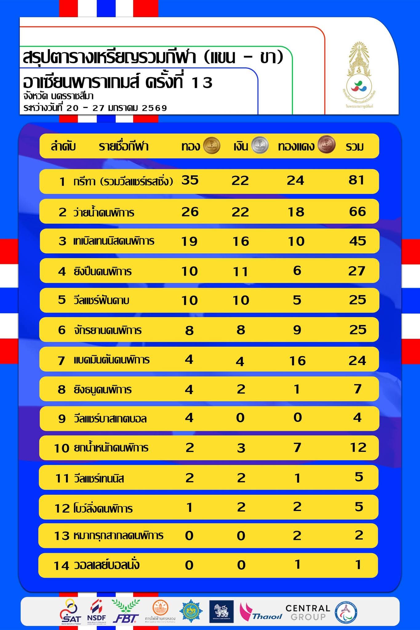 สรุปเหรียญทีมชาติไทย 🎉 ประจำวันที่ 21 มกราคม 2026 🥇 เหรียญทอง 35 เหรียญ 🥇 ✅ บาสเกตบอล 3x3 ทีมหญิง ✅ บาสเกตบอล 3x3 ทีมชาย ✅ ว่ายน้ำ กบ 100 ม. ชาย คลาส SB14 ✅ ว่ายน้ำ กบ 100 ม. หญิง คลาส SB7-SB8 ✅ ว