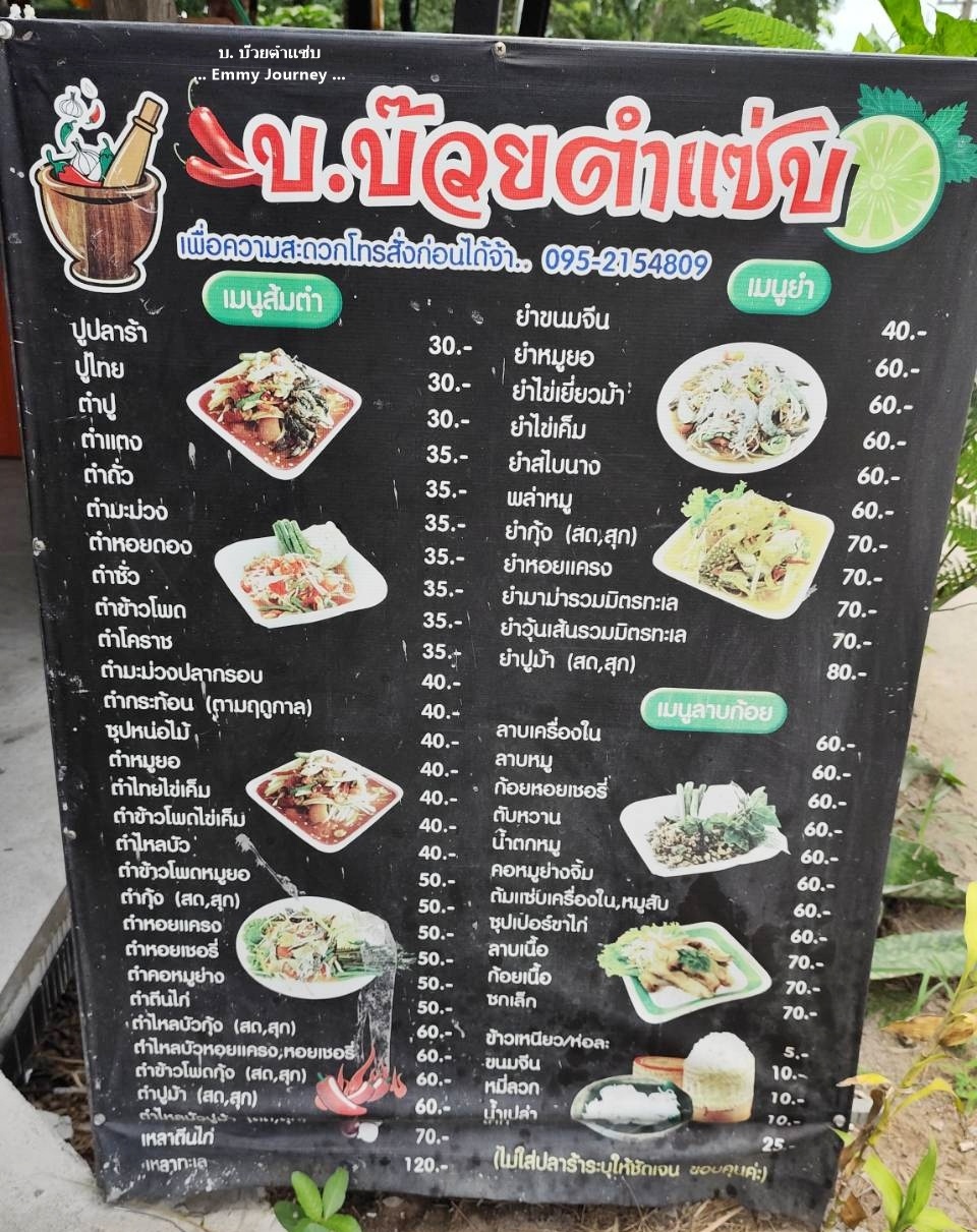 พามาทานส้มตำไกลถึงจังหวัดชัยนาท ชื่อร้าน บ.บ๊วยตำแซ่บ (พุทธคุณส้มตำ) เป็นร้านอาหารอีสานในเขตวัดสิงห์ ตั้งอยู่ที่ถนนประชาราษฎร์บำรุง ตำบลวัดสิงห์ จังหวัดชัยนาท ถ้ามาจากอำเภอวัดสิงห์ ร้านจะอยู่ทางซ้ายมือ ถ้ามาจากวัดปากคลองมะขามเฒ่า ร้านจะอยู่ทางขวามือ ร้านเปิดเวลา 9.30-15.00 น. ไม่มีที่จอดรถ หาจอดได้ริมถนน ไม่มีห้องแอร์ ที่นั่งมีจำกัด ถ้าไปทานตอนกลางวัน แนะนำให้โทรสั่งล่วงหน้า เพราะคนเยอะมากและอาจต้องรออาหารสักพัก เพราะแม่ค้าตำคนเดียว ครกต่อครก ปรุงเองทุกครก ทุกจาน