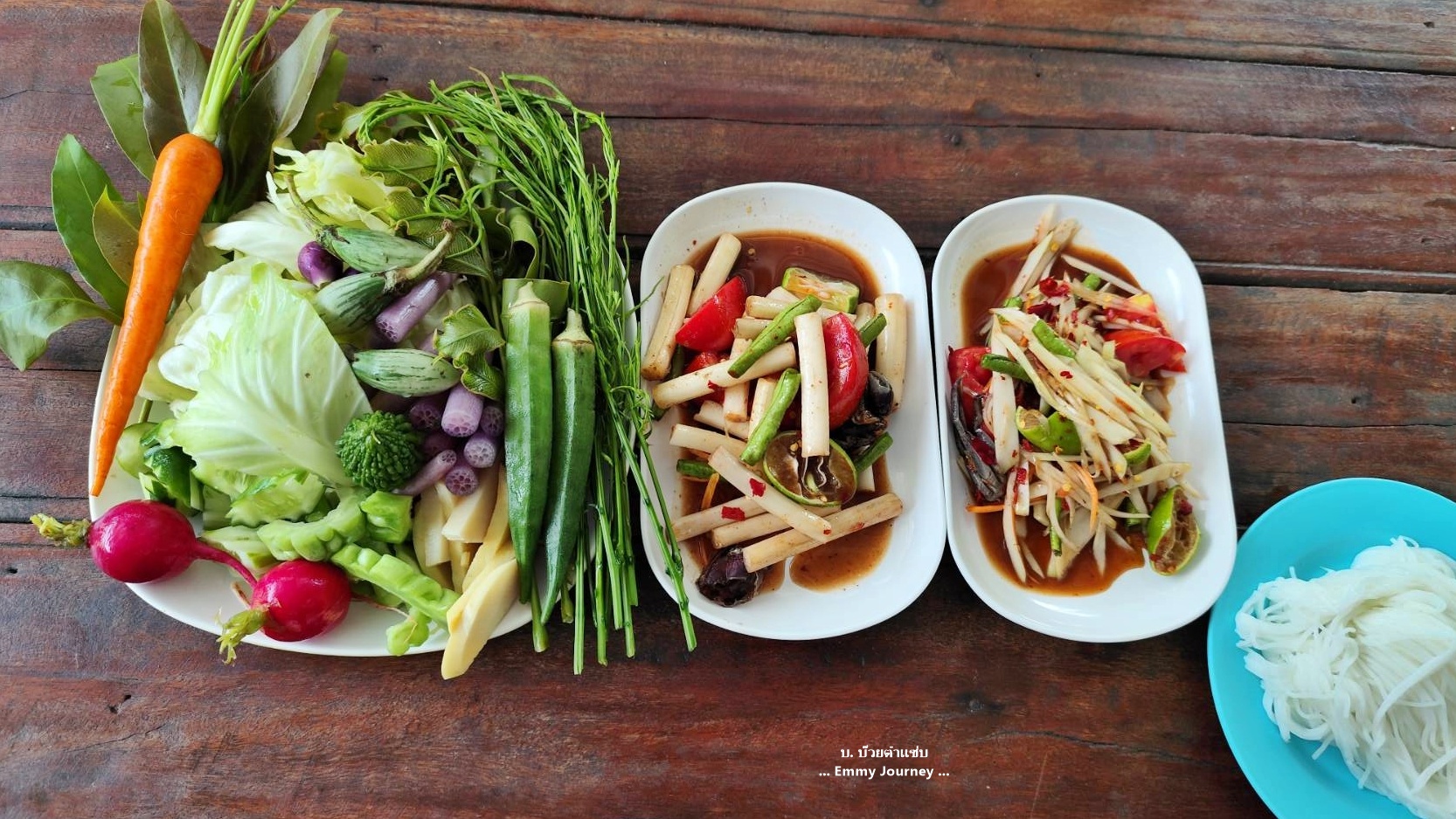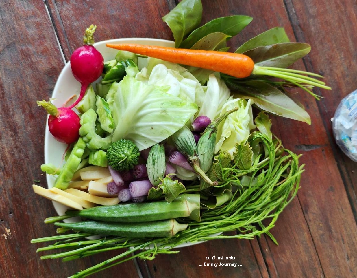 ที่ร้านเสิร์ฟผักสดมาแบบนี้เลย ชอบมากค่ะ ผักหลากหลายดี ล้างสะอาดด้วย