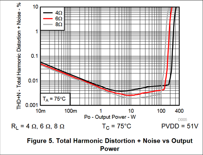 คราวนี้มาดูวัตต์ที่ไม่เท่ากันของเครื่องขยายเสียงผมจะใช้ข้อมูลของ WONDOM Bru5 DSP เป็นตัวอย่าง เครื่องขยายเสียงรุ่นนี้ส่วนใหญ่จะระบุว่า 600 W คือ 300 W + 300 W ที่โหลด 3 Ω ตาม IC Datasheet บางประเทศระบุสเป็คว่า 160 W/Ch หากเรานำมาตรฐาน HiFi ไปใช้เครื่องขยายเสียงเครื่องนี้จะอยู่ที่ 120 W/Ch ที่โหลด 8 Ω กำลังขับเท่านี้เพียงพอที่จะขับลำโพง Subwoofer ขนาด 10 นิ้วทั่วไปได้สบาย