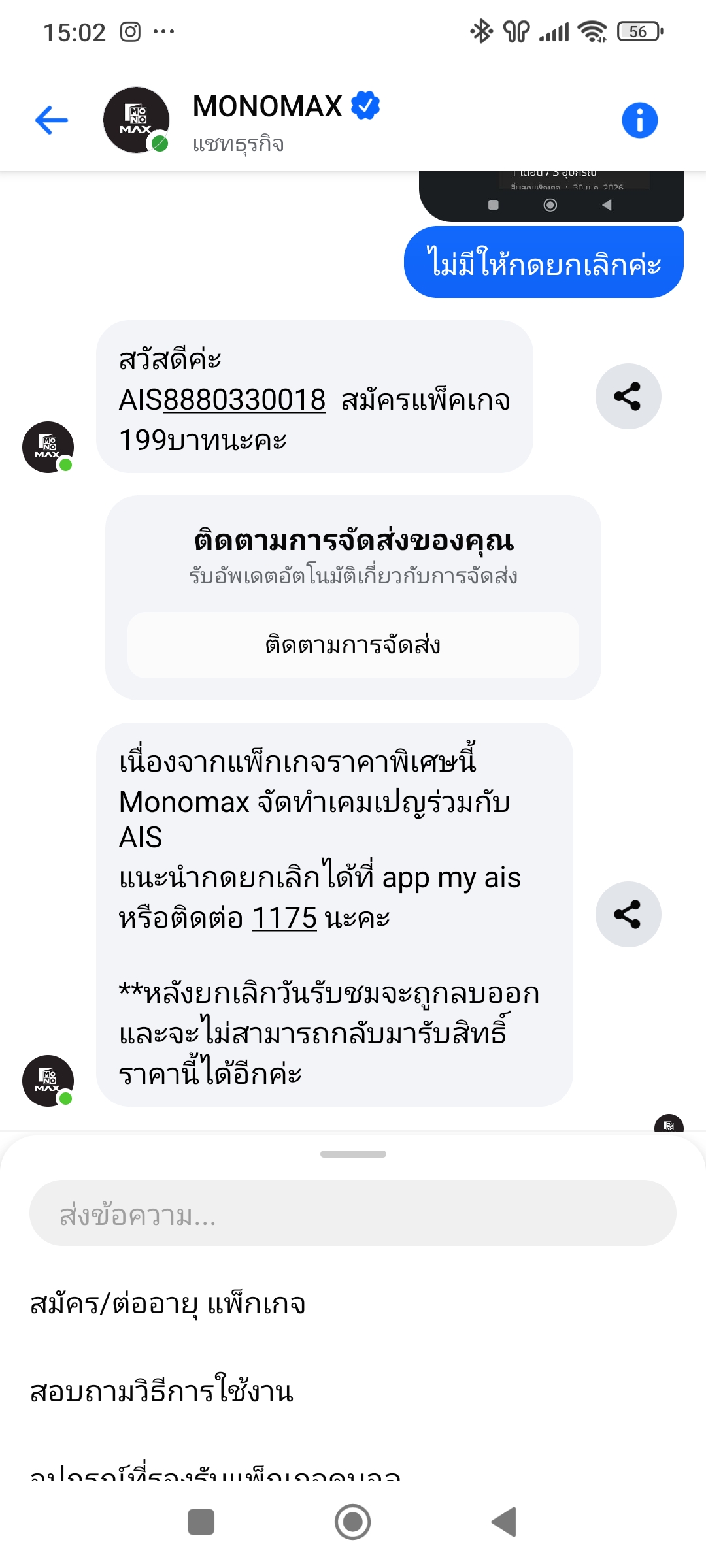 เราสมัครเน็ตผิด มือไปโดนแพ็คเกจmono max ของais พอเห็นว่ายอดมันไม่ใช่ที่สมัครประจำเลยรีบเข้าไปยกเลิกที่ my ais ส่งเรื่องไป ติดต่อผ่านอุ่นใจแล้วก็ส่งเรื่องรอตอบกลับทางเมล ก็ไม่มีความคืบหน้าเลยค่ะ แบบนี้