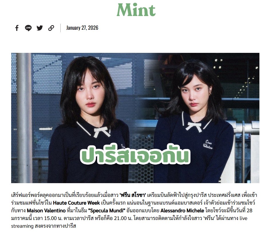 เสิร์ฟแอร์พอร์ตลุคออกมาเป็นที่เรียบร้อยแล้วเมื่อสาว 'ฟรีน สโรชา' เตรียมบินลัดฟ้าไปสู่กรุงปารีส ประเทศฝรั่งเศส เพื่อเข้าร่วมชมแฟชั่นโชว์ใน Haute Couture Week เป็นครั้งแรก แน่นอนในฐานะแบรนด์แอมบาสเดอร์ เจ้าตัวย่อมเข้าร่วมชมโชว์กับทาง Maison Valentino ที่มาในธีม "Specula Mundi" อันออกแบบโดย Alessandro Michele โดยโชว์จะมีขึ้นวันที่ 28 มกราคมนี้ เวลา 15.00 น. ตามเวลาปารีส หรือก็คือ 21.00 น. โดยสามารถติดตามให้กำลังใจสาว 'ฟรีน' ได้ผ่านทาง live streaming สงตรงจากทางปารีส