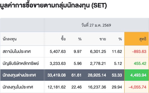 Sinthorn Summary 27/1/2569 : ต่างชาติซื้อสุทธิ 4,493.94 ลบ.