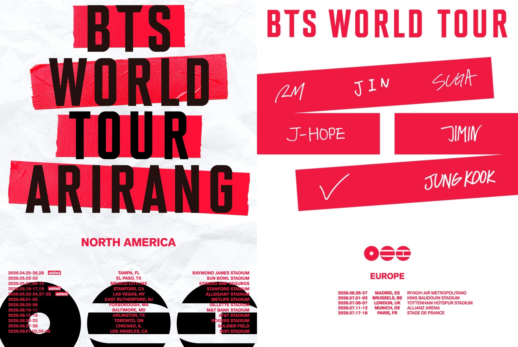 ขณะเดียวกัน BTS จะเริ่มต้นทัวร์ยุโรปในวันที่ 26–27 มิถุนายน ที่สนาม Riyadh Air Metropolitano, Madrid (Spain) ก่อนจะเดินทางไปจัดการแสดงในเมืองหลักของยุโรป ได้แก่ Brussels (Belgium), London (United Kingdom), Munich (Germany) และ Paris (France) รวมทั้งหมด 5 เมือง 10 รอบการแสดง