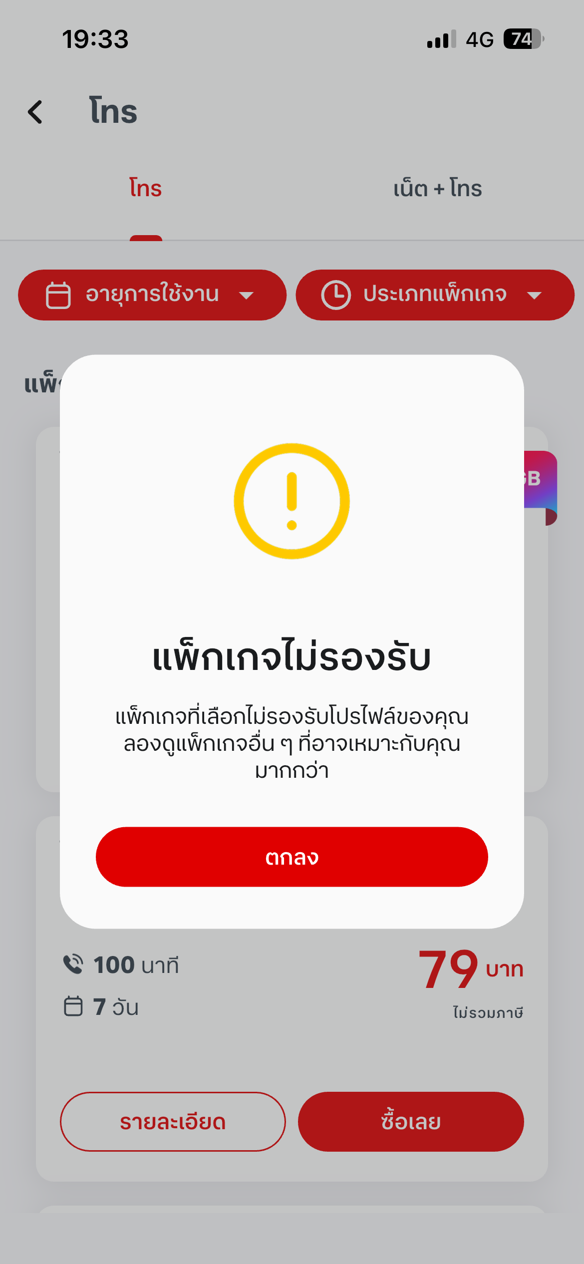 ต้องการสมัครแพ็คเกจเสริมโทรของซิมรายเดือน แต่ไม่สามารถสมัครได้ค่ะขึ้นแพ็คเกจไม่รองรับทุกอัน
