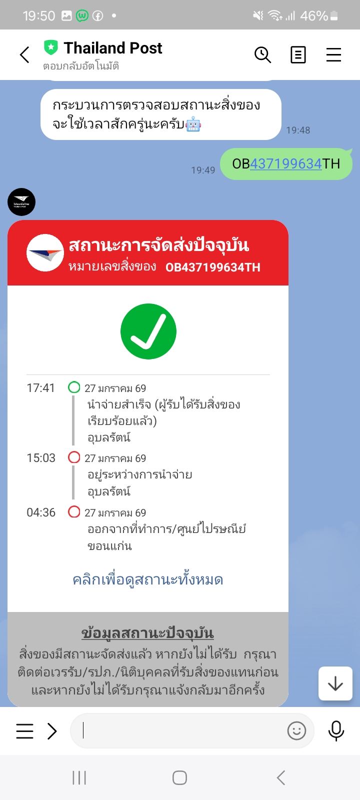 อยากทราบว่าสถานะพัสดุไปรษณีย์ไทยนำส่งสำเร็จแต่ยังไม่ได้ของเลย