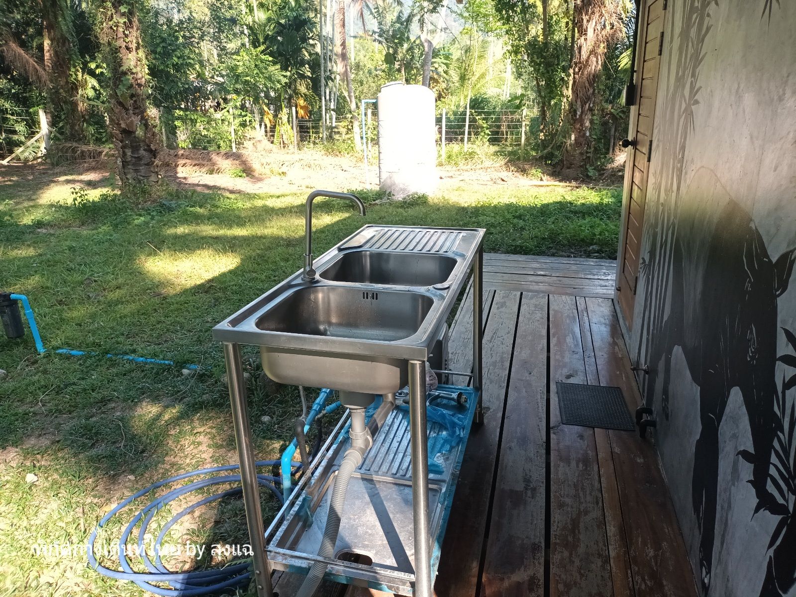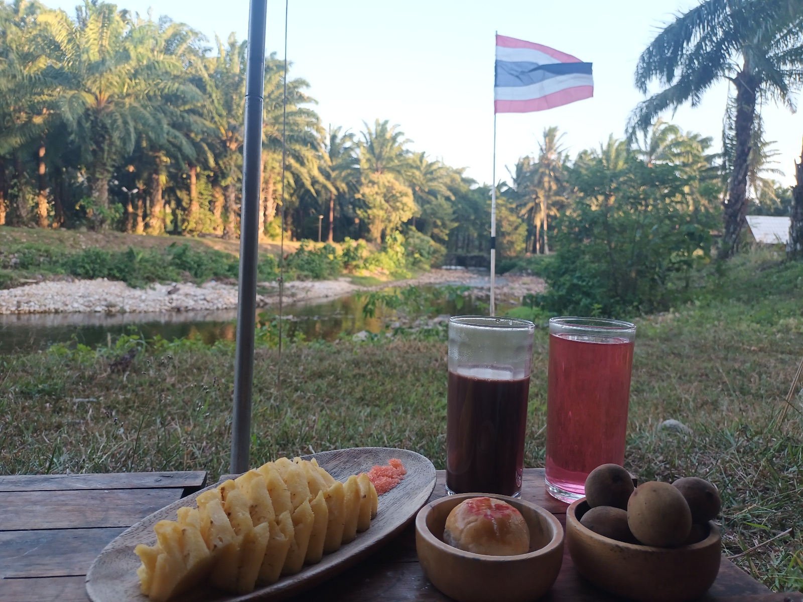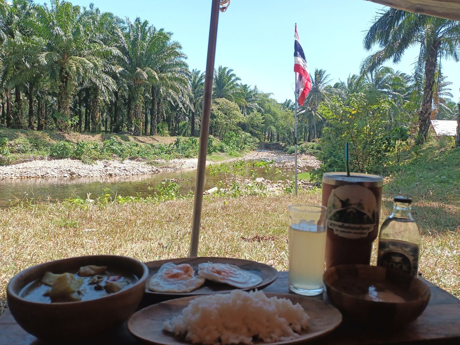 บ่าย 4 โมงกว่า แดดเริ่มอ่อนแรง ไปเดินดูลานฝั่งตรงข้ามและร้านอาหาร ห้องน้ำทำดีมาก มีที่ล้างจานชามด้วย แต่จะไกลจากที่ผมกางเกือบร้อยเมตรได้ครับ ฝั่งนั้นจะร่มรื่นทั้งวัน ด้วยอยู่ใต้ต้นปาล์มที่สูงใหญ่แล้ว แต่จุดที่ผมกางจะเห็นลำธารสวยกว่าครับ ออ บรรยากาศร้านอาหารก็ดีมากครับ