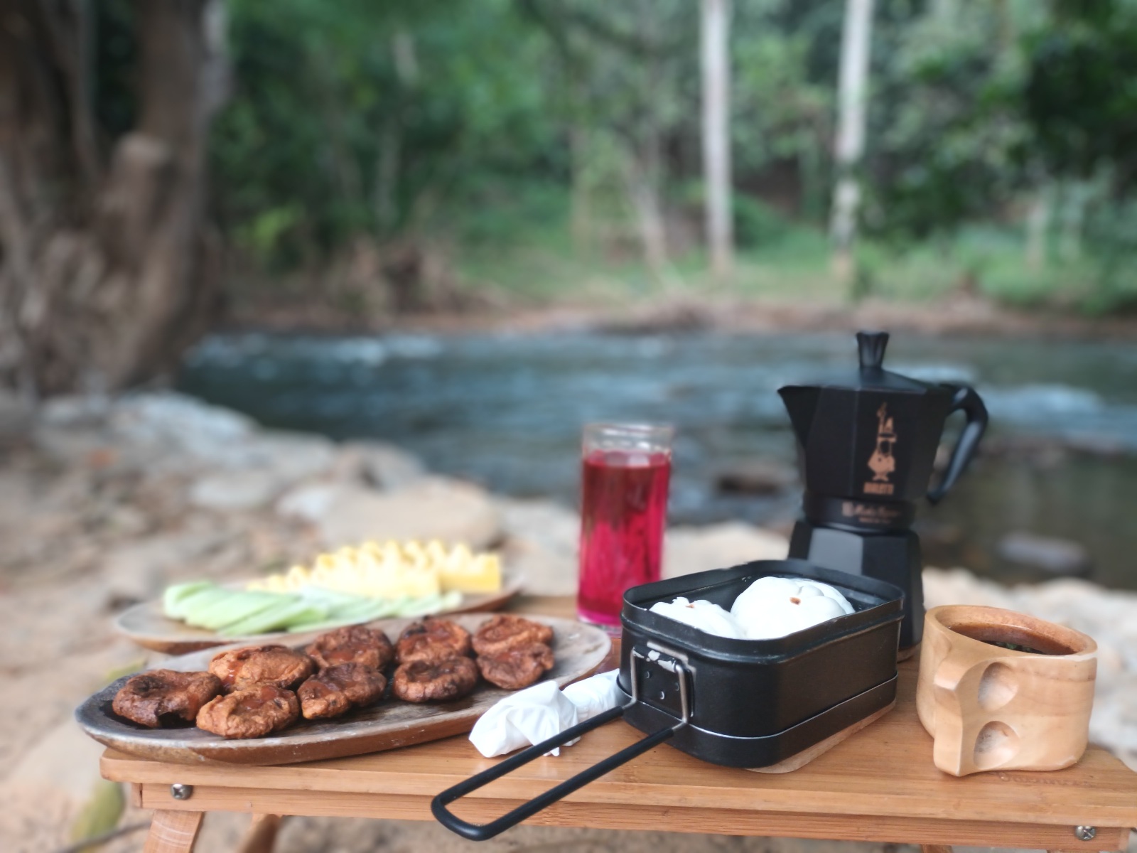 ยกออกมาทำทรงข้างๆ เต็นท์ วิวและบรรยากาศดีมาก นั่งมองสายน้ำและกินอาหารไปด้วย มันดีต่อใจมากๆ ครับ ขอบคุณตัวเองที่อยู่ในบรรยากาศที่สวยงามเช่นนี้