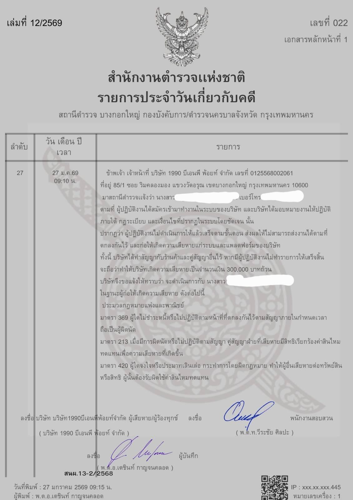 แล้วที่นี้ เราโอนยอดชำระภาษี คือ ต้องพิมพ์ตามที่กำหนด แต่ว่าตุนไม่ได้อ่านที่ ทางนั้นเขาแจ้ง โอนไป 3 รอบก็คือ ไม่ผ่าน เราเงียบไป 2วันคะ 2วันที่ผ่านมา ท่านนั้นเขาก็ทักมาว่า ทางระบบเปิดให้บริการแล้ว พร้อมทำรายการแจ้งดิฉันได้เลยนะคะ พอเข้าวันที่ 3 ตุน "ใบสำนักงานตำรวจแห่งชาติ รายการประจำวันเกี่ยวกับคดีคะ" ที่เราได้วันนี้มา แล้วทีนี้เราก็เลยเกิดความกลัวขึ้นมาคะ ก็เลยโอนชำระภาษีเพิ่มไป ก็ยังไม่ถูกต้อง ตามที่เขาระบุ ณ ตอนนี้ เราบล็อคไปแล้ว แต่ว่าเราจะดูเอกสารได้ยังไงว่าของจริง หรือ ข่มขู่คะ