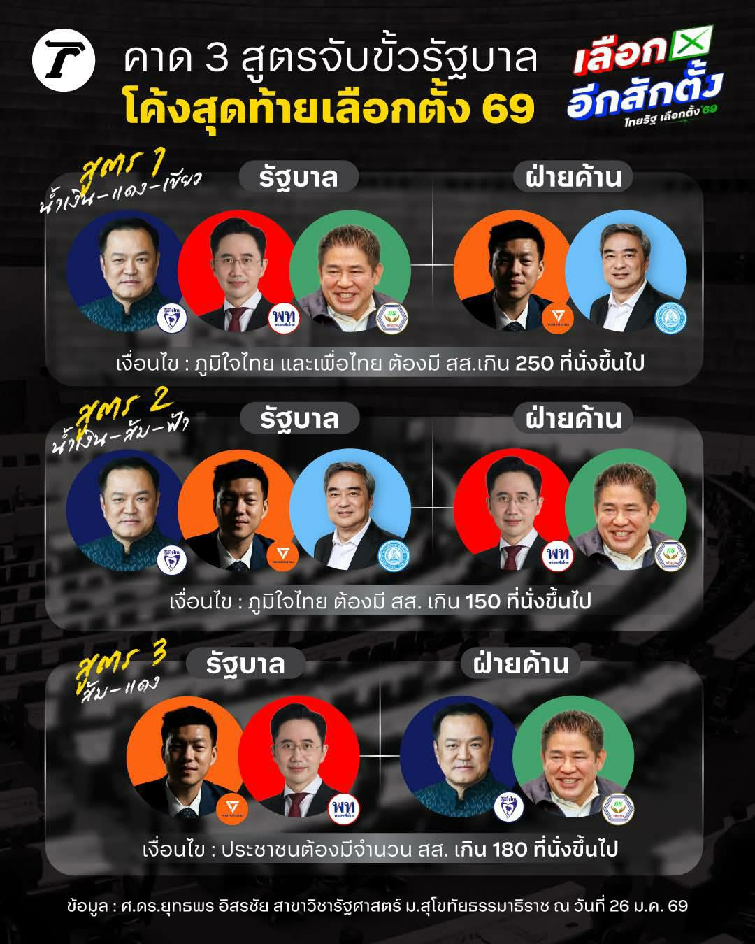 คาด 3 สูตรจับขั้วรัฐบาล โค้งสุดท้ายเลือกตั้ง 2569 "นักวิชาการ" ประเมินสูตร "น้ำเงิน-แดง-เขียว" ผลัก"ส้ม-ฟ้า" เป็นฝ่ายค้าน มีโอกาสเป็นไปได้สูงสุด