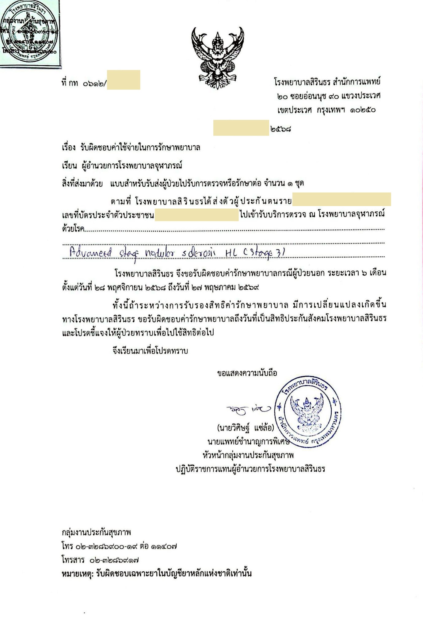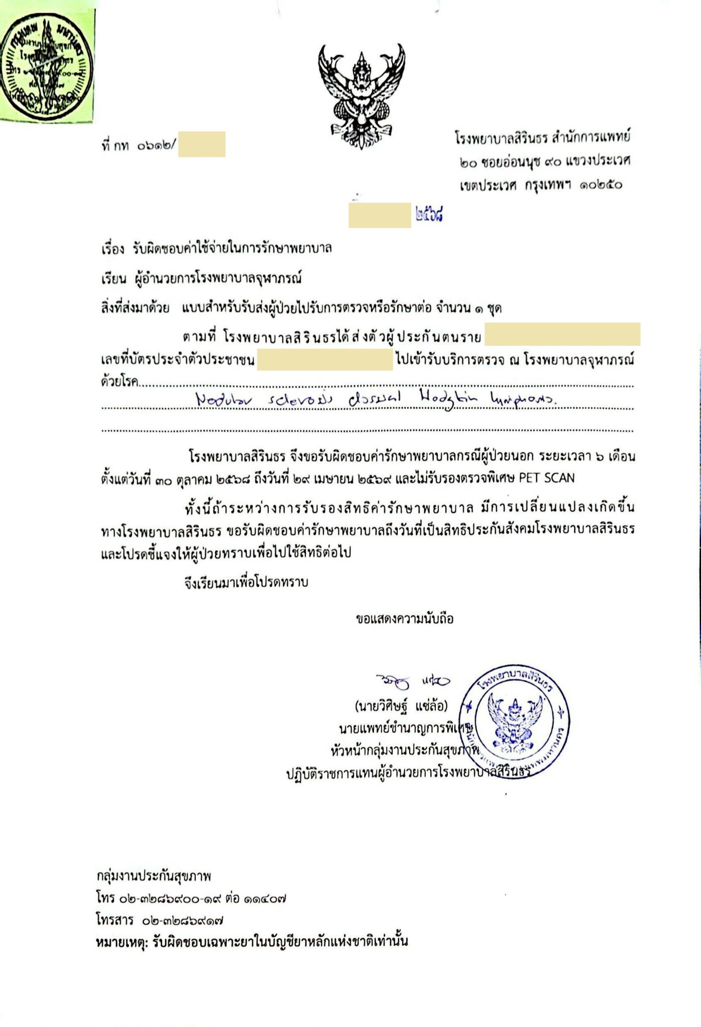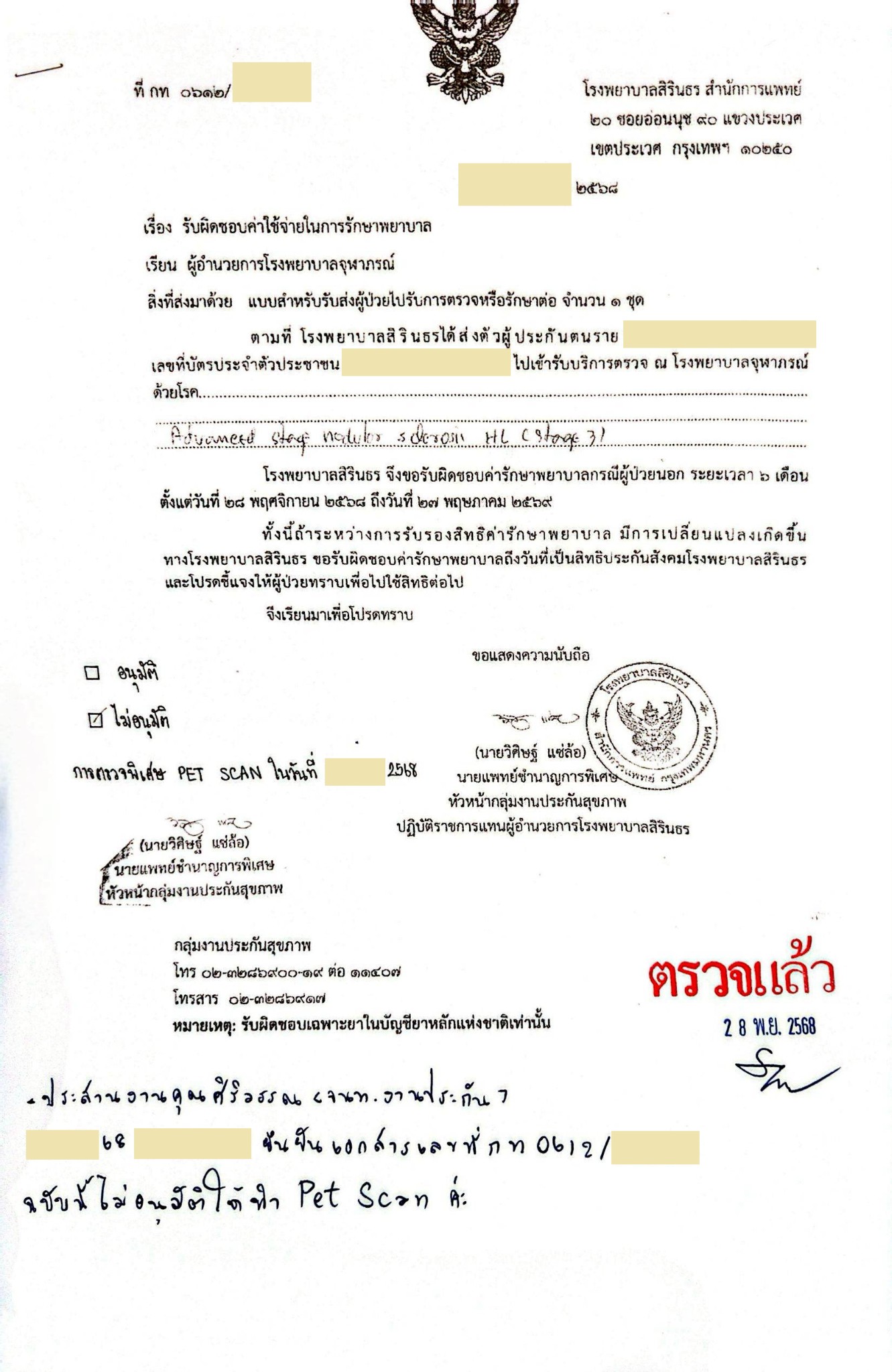ผมได้ใบส่งตัว สิทธิประกันสังคม รพ.สิรินธร ส่งตัวไป รพ.จุฬาภรณ์ พร้อมระบุ "ไม่รับรองตรวจพิเศษ PET SCAN" ทั้งๆ ที่ รพ.สิรินธร ไม่มี -