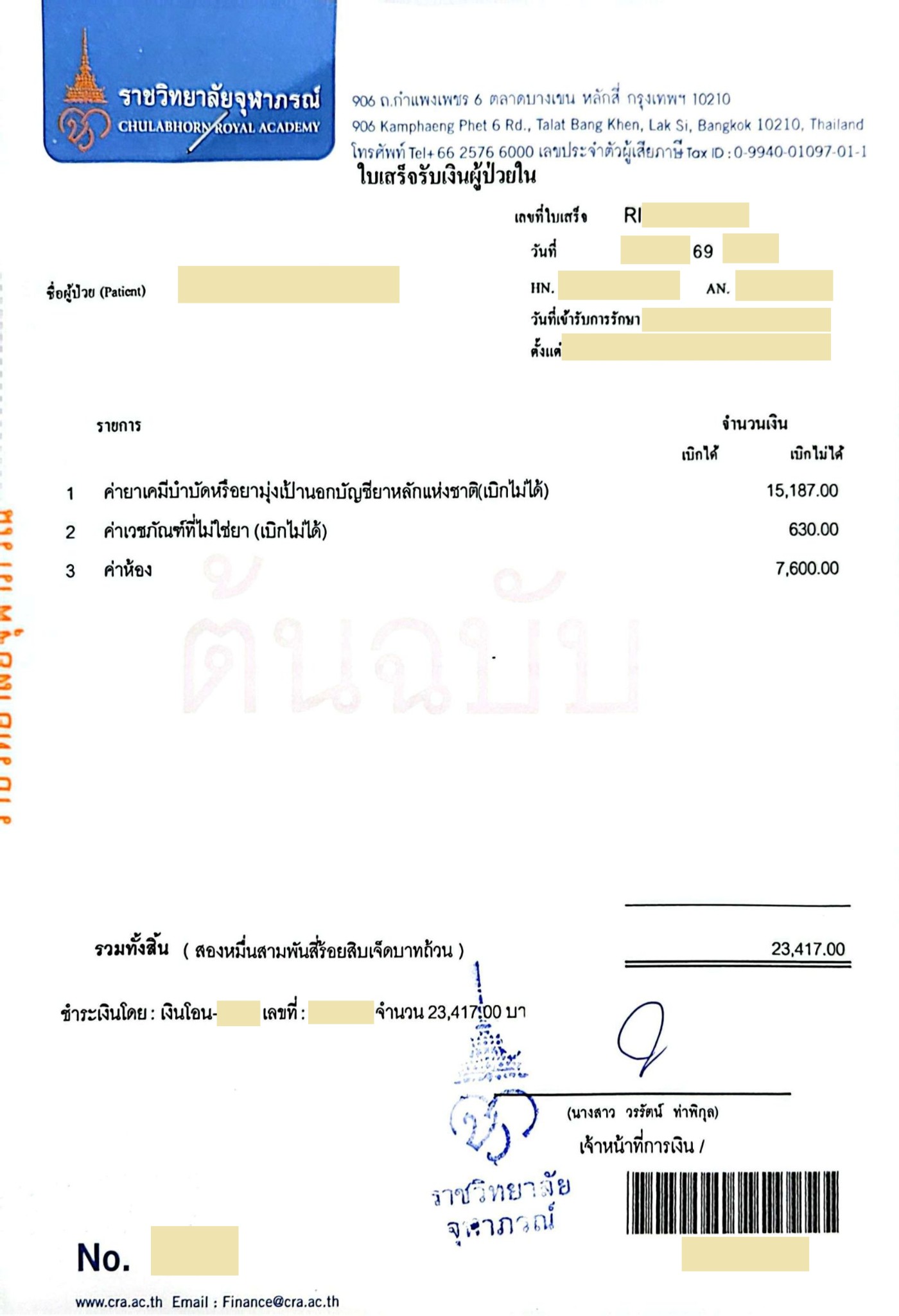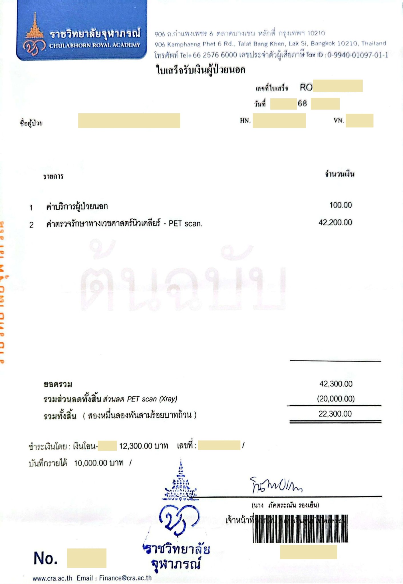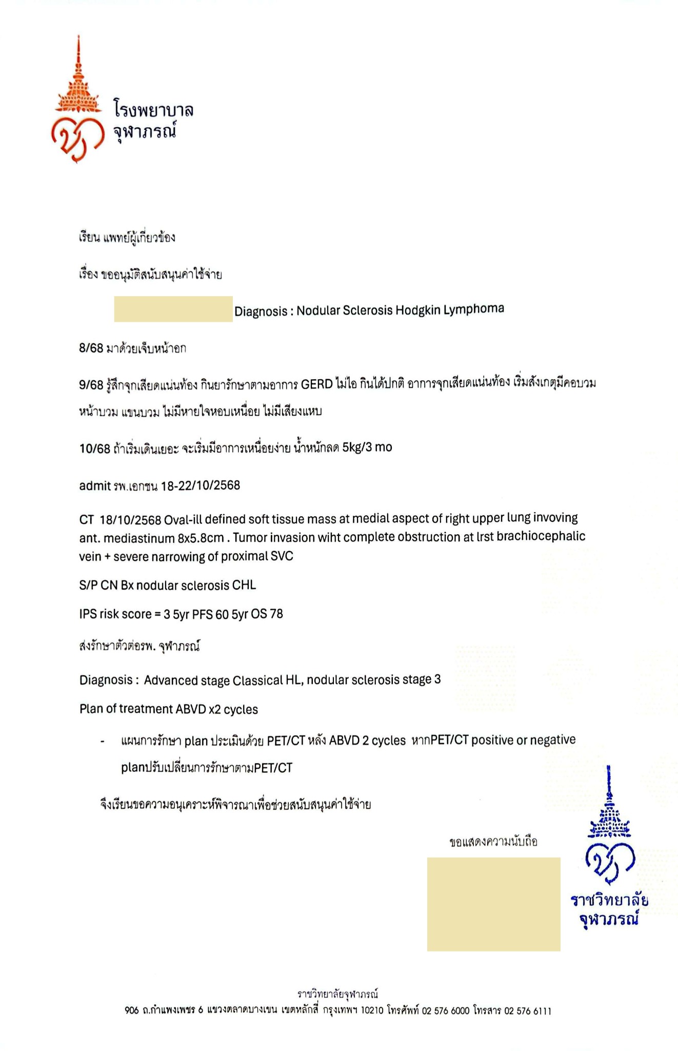 การรักษาคุณหมอ+พยาบาล รพ.จุฬาภรณ์ ดูแลและรักษาดีมาก, ช่วยเหลือเต็มที่มาก, ทำให้ผมอาการดีขึ้นมากๆ ครับ และ คุณหมอ รพ.จุฬาภรณ์ ยังช่วยเขียนจดหมาย ขออนุมัติสนับสนุนค่าใช้จ่าย PET SCAN ให้กลับไปยื่น สิทธิประกันสังคม รพ.สิรินธร เพราะคุณหมอ รพ.จุฬาภรณ์ ท่านวินิจฉัยแล้วว่าต้องใช้จริง (และ คุณหมอ รพ.สิรินธร ก็เห็นด้วย)