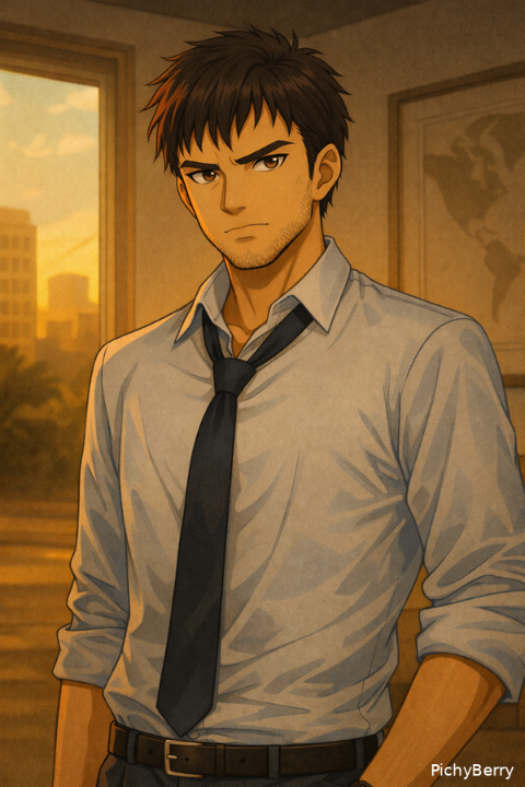 เส้นผมสั้นสีเข้มถูกจัดทรงเรียบร้อย แต่ไม่เนี้ยบจนดูเป็นคนในออฟฟิศ ดวงตาสีน้ำตาลเข้มจ้องมองนิ่ง เยือกเย็น และเฉียบคม—สายตาแบบเดียวกับนักล่าที่คุ้นเคยกับการเฝ้าดูเหยื่อเป็นเวลานานโดยไม่กระพริบตา เขาไม่ใช่คนที่แสดงอารมณ์ทางใบหน้า แต่ทุกครั้งที่ขมวดคิ้วเล็กน้อย หรือเม้มริมฝีปากแน่น จะทำให้บรรยากาศรอบตัวหนักขึ้นโดยไม่ต้องพูดอะไรเลย