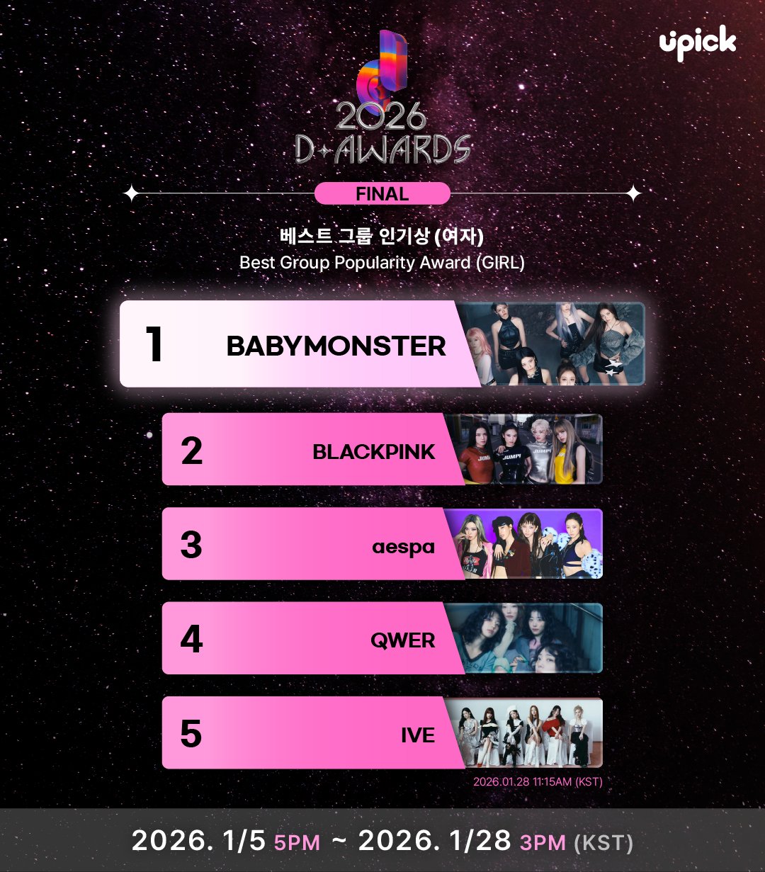 BABYMONSTER ชนะรางวัล the Best Group Popularity Award (Girl) หรือรางวัลศิลปินเคป๊อปยอดนิยมประจำปีงาน 2026 D Awards