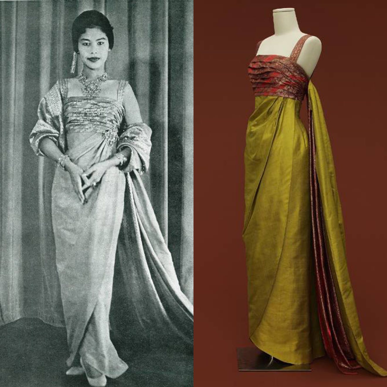 ฉลองพระองค์ชุดราตรีของสมเด็จพระนางเจ้าสิริกิติ์ พระบรมราชินีนาถ พระบรมราชชนนีพันปีหลวง ตัดเย็บจาก ผ้าไหมและผ้าไหมยกทอง ออกแบบโดย ปิแอร์ บัลแมง (Pierre Balmain) แห่งห้องเสื้อบัลแมง ประเทศฝรั่งเศส