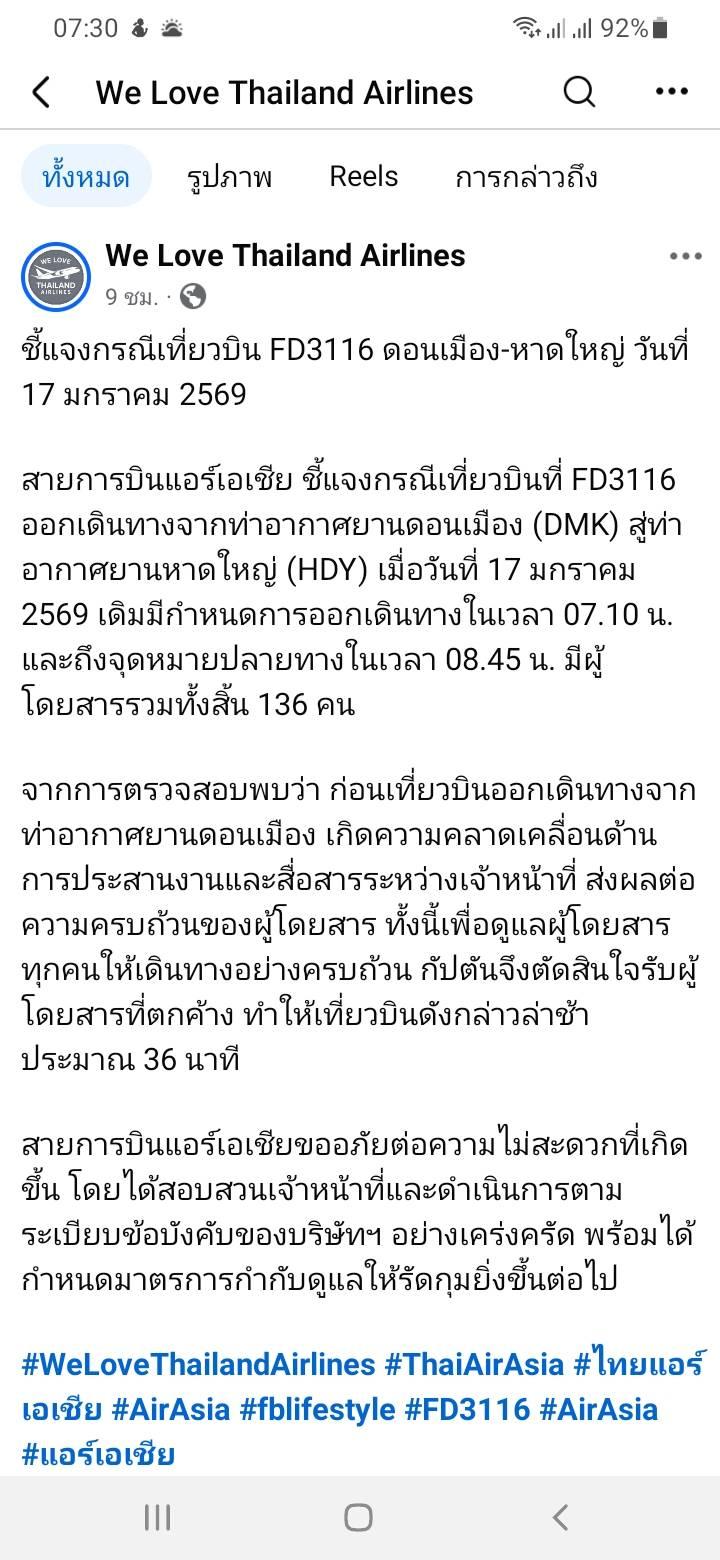 สายการบินแอร์เอเชีย ชี้แจงกรณีเที่ยวบินที่ FD3116 ออกเดินทางจากท่าอากาศยานดอนเมือง (DMK) สู่ท่าอากาศยานหาดใหญ่ (HDY) เมื่อวันที่ 17 มกราคม 2569 เดิมมีกำหนดการออกเดินทางในเวลา 07.10 น. และถึงจุดหมายปลายทางในเวลา 08.45 น. มีผู้โดยสารรวมทั้งสิ้น 136 คน