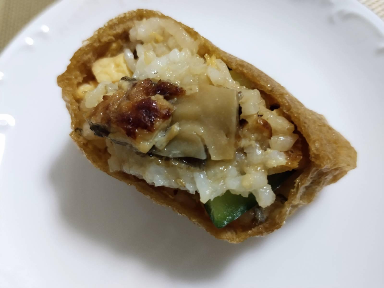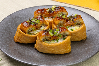 นำข้าวซูชิ ที่ใส่ปลาไหลแล้ว มาสอดไส้ในแผ่นเต้าหู้ เสิรฟใส่จาน พร้อมทาน