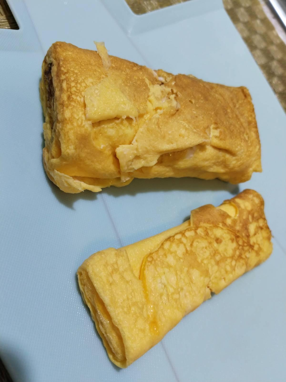 บางทีก็ใส่น้ำตาลทราย มายองเนส แล้วแต่ชอบ เจียวในกระทะ 4 เหลี่ยม ทบไปเรื่อย ๆ เป็นชั้น ๆ