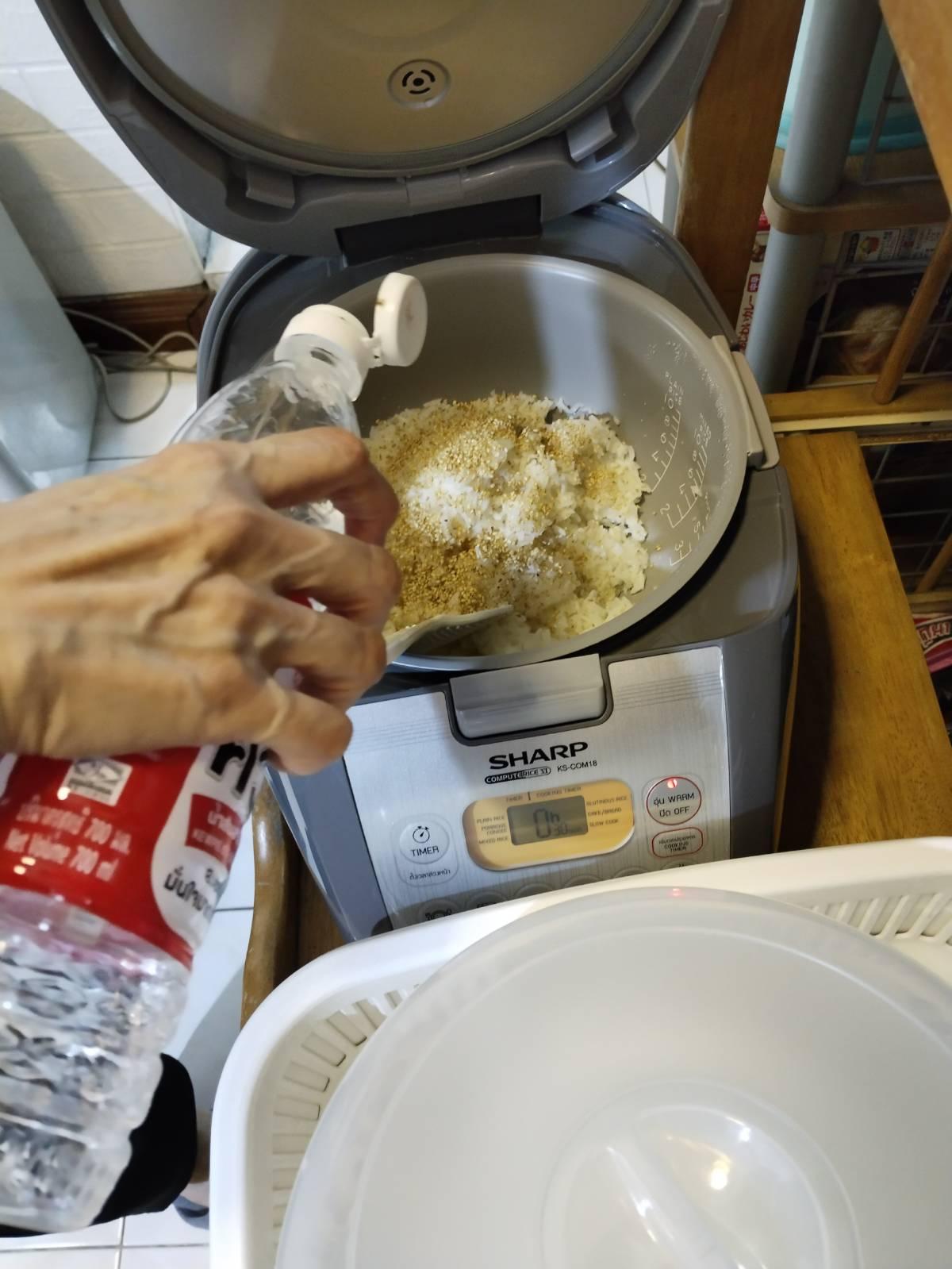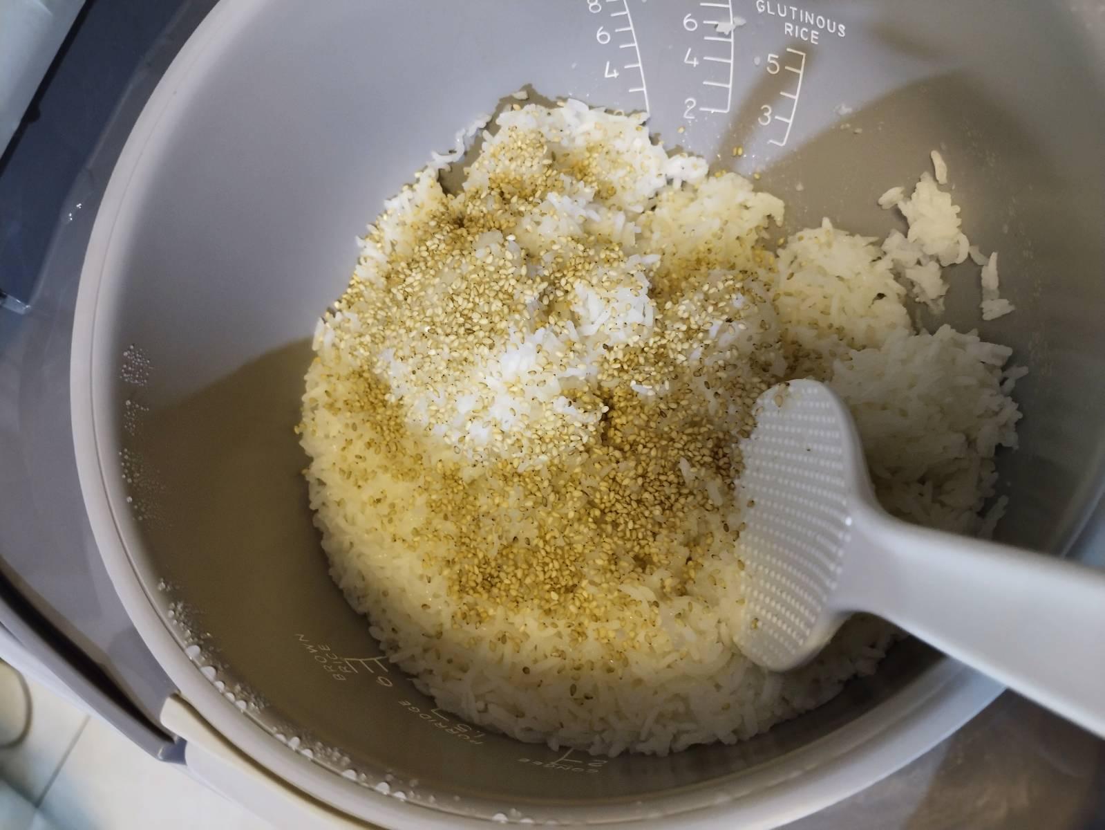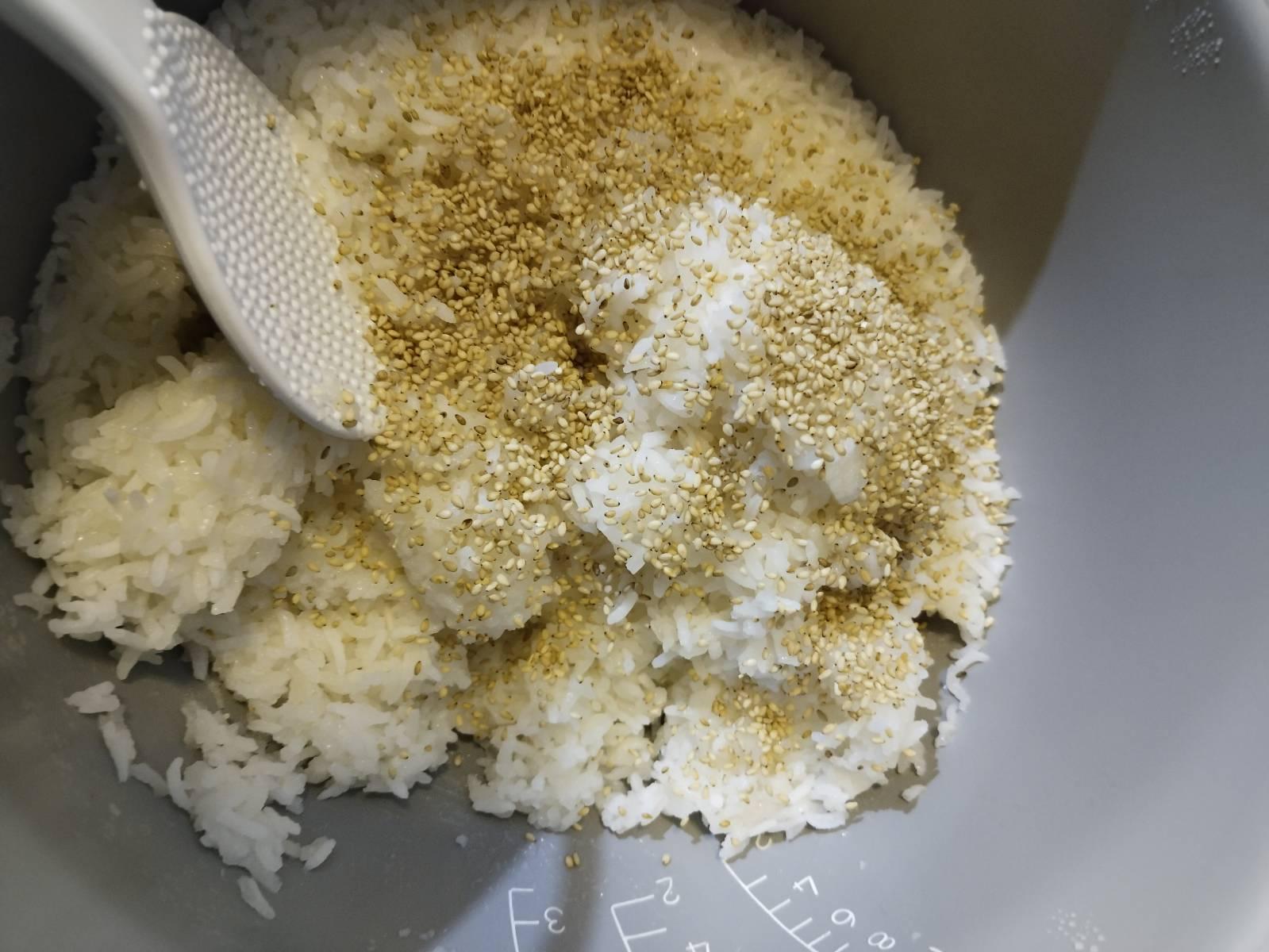 หุงข้าว ผสมข้าวเหนียว 1 ต่อ 1 สุกแล้วร้อน ๆ นำน้ำส้มสายชูที่ผสมน้ำตาล งาขาวคั่ว คลุกเคล้า ให้ทั่ว อย่าให้ข้าวเละ