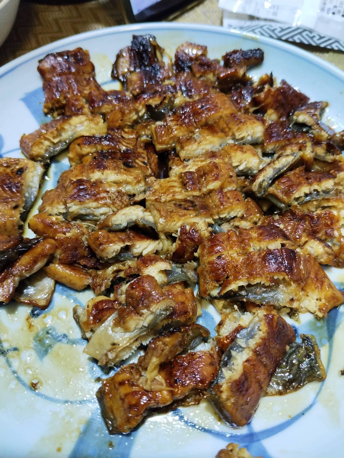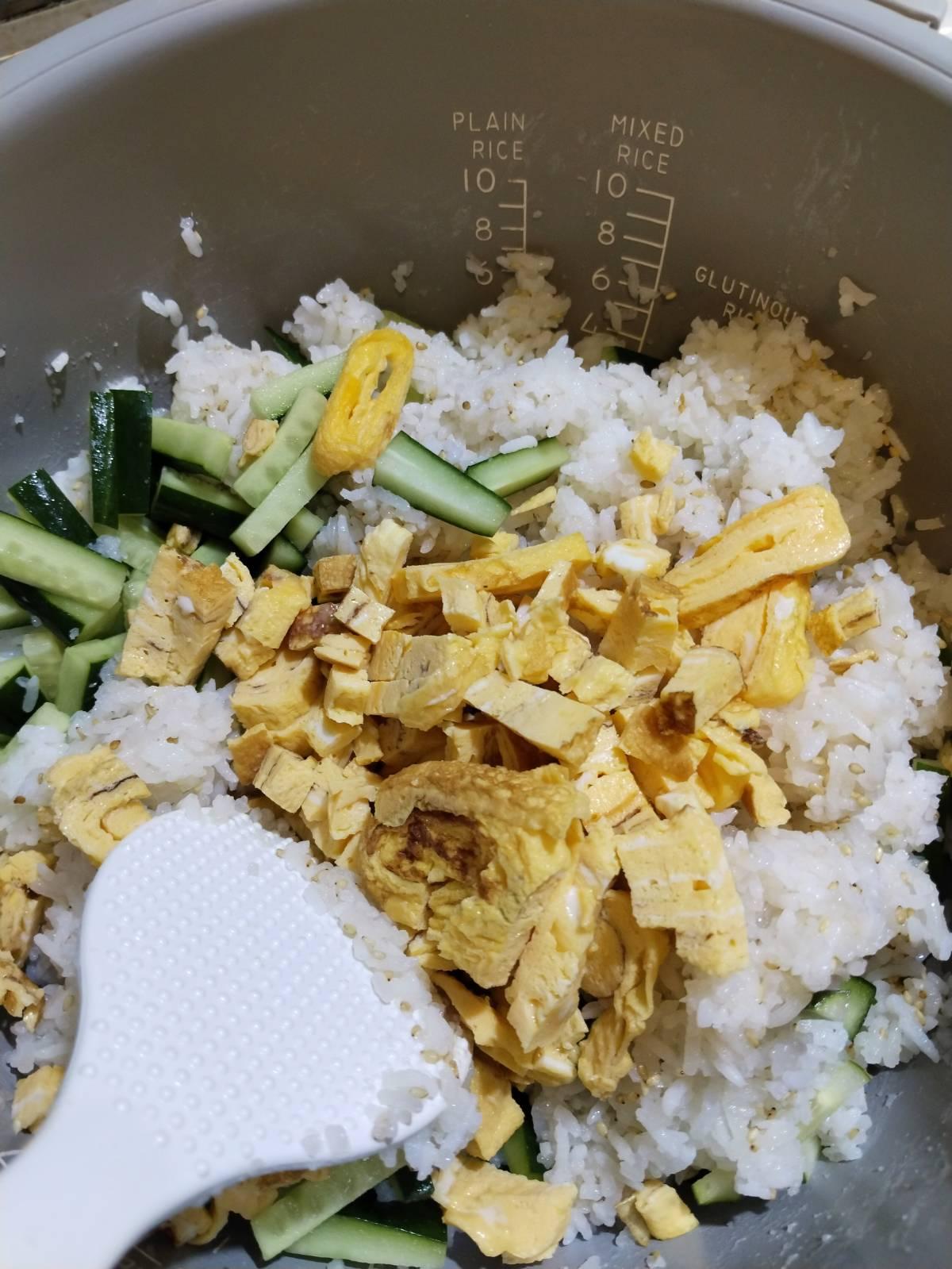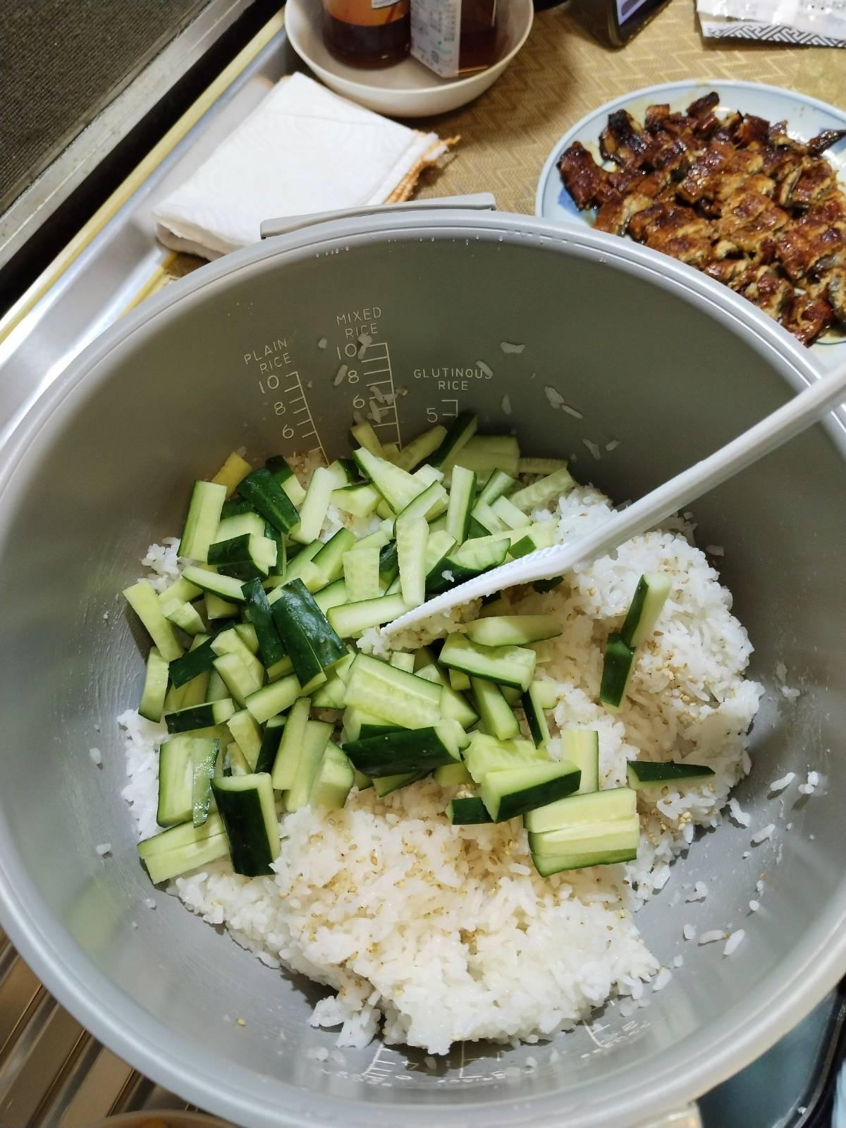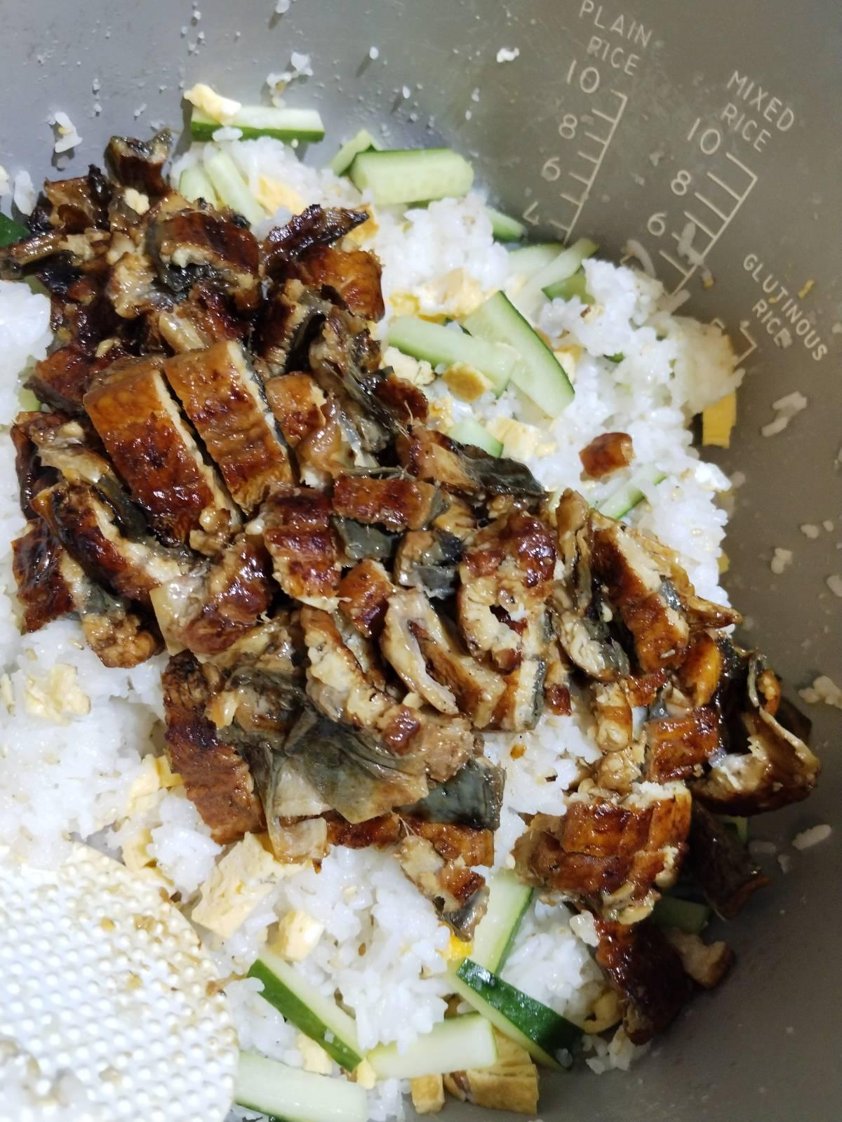 ใส่ปลาไหล อุนางิสำเร็จรูป อุ่นในไมโครเวฟ หั่นเป็นชิ้นเล็ก ไข่เจียว เทซอสอุนางิลงไปเล็กน้อย อย่าให้เละมาก ตามด้วยแตงกวาหั่นยาว